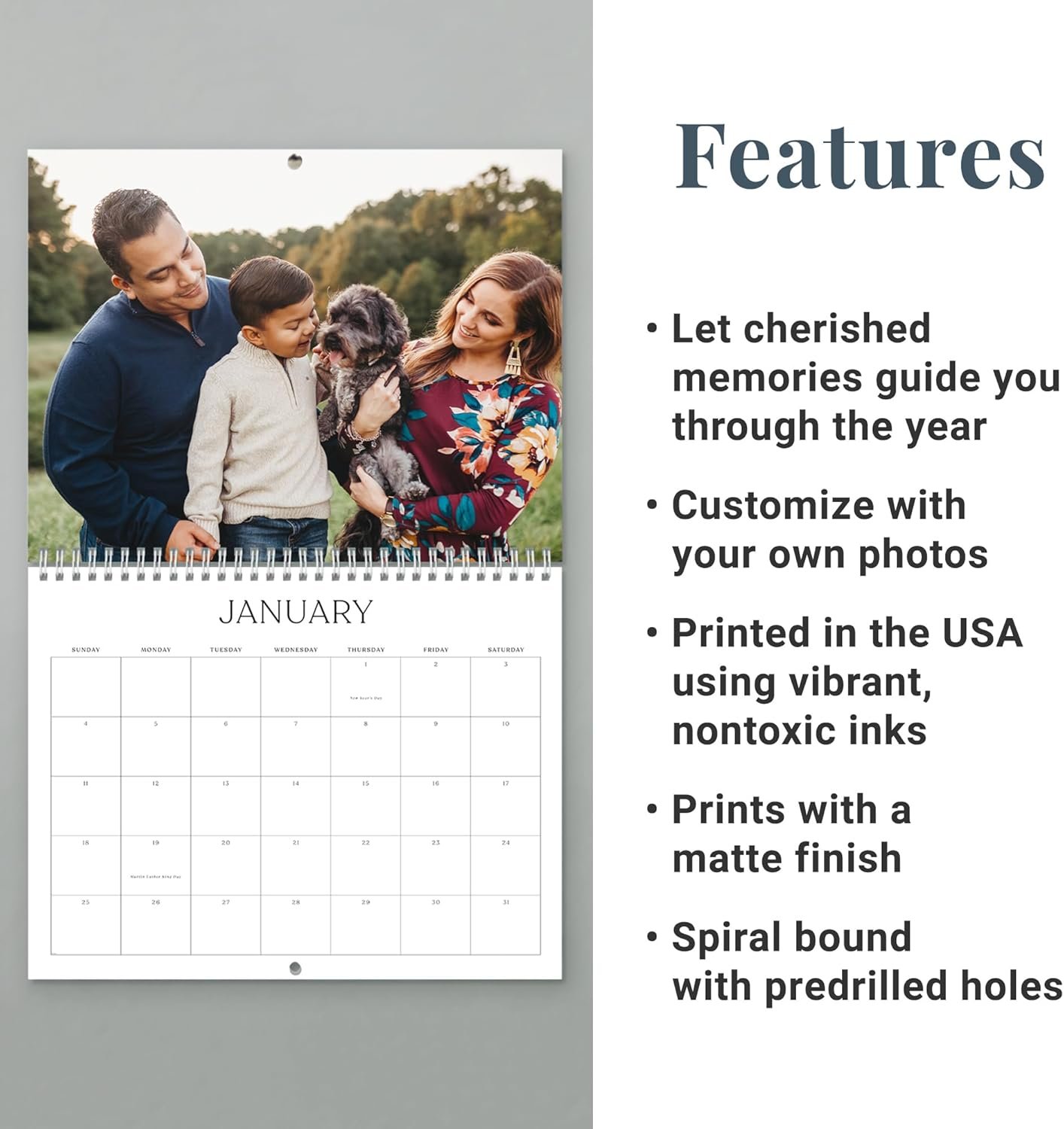PICTURE PERFECT: Start the year off right with a customized calendar featuring your favorite photos! Show off your family, friends, pets, or travel adventures by displaying this classic wall calendar anywhere. Our calendars make perfect presents for family and friends near or far, and are great for Christmas gifting!