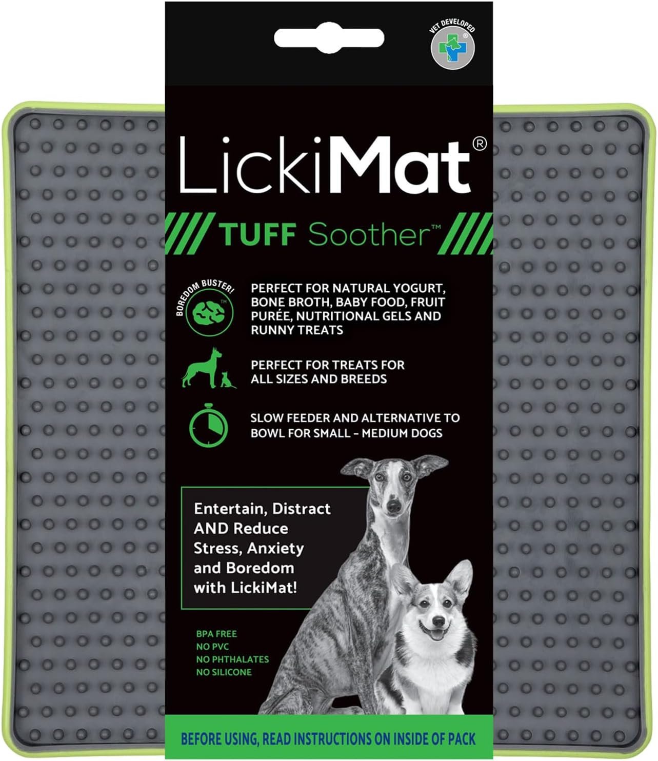 New TUFF series: Chew-resistant, non-slip rubber feet and 100% dishwasher safe. Same soft Authentic LickiMat rubber surface for pleasurable licking action and healthier teeth, gums and fresher breath. Gentle on your pet’s tongue. The tough LickiMat. Developed and recommended by Vets.