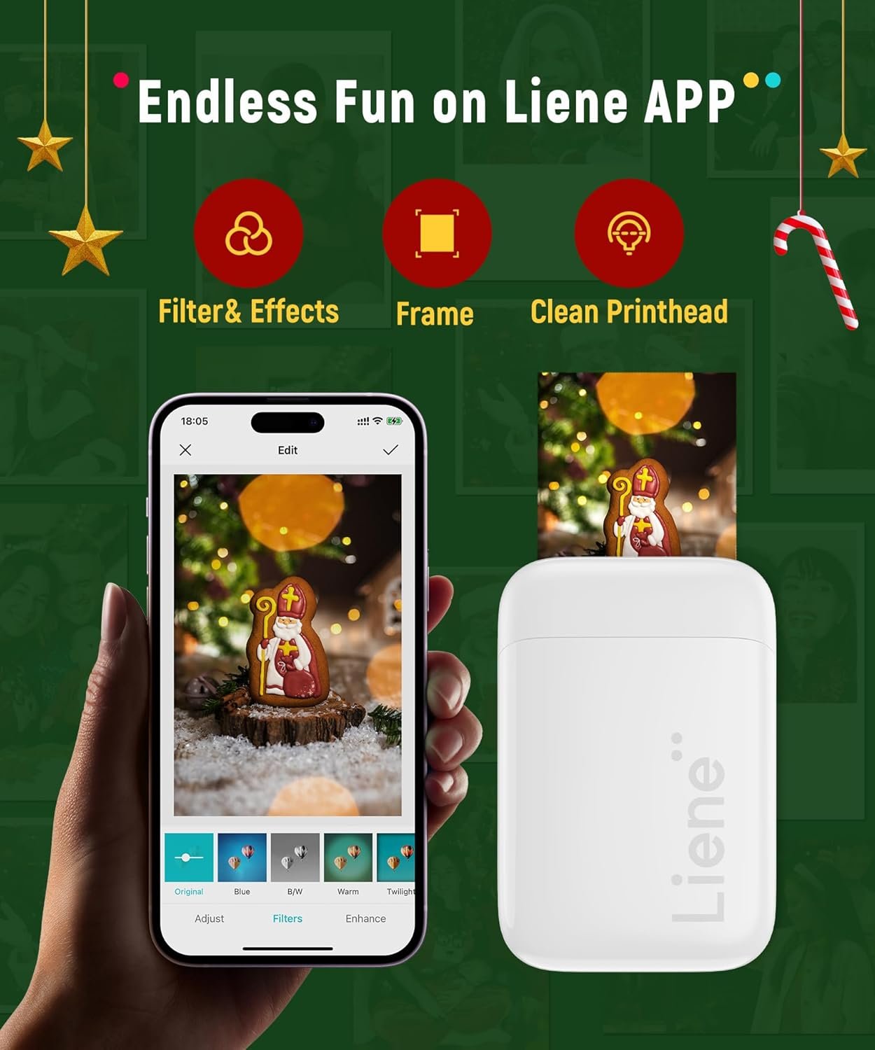 [New App function – Clean print head] Don’t know what to do when there are white spots, white lines or other dirt on the photo when printing? The Liene phone printer has added a new feature (clean print head) to the photo app, which greatly solves the problem and gives you better photo quality. Note: A blue calibration card is required when cleaning the print head. See the videos on the product page for details. Note: Photos can only be printed through the Liene app.