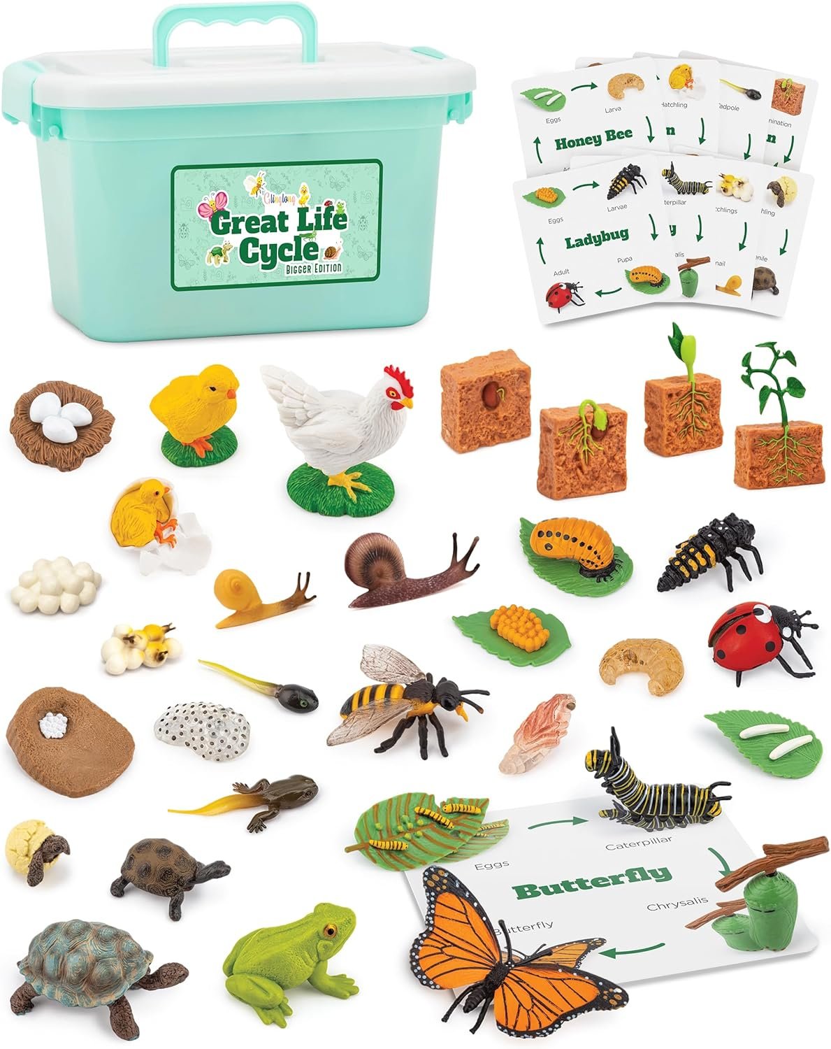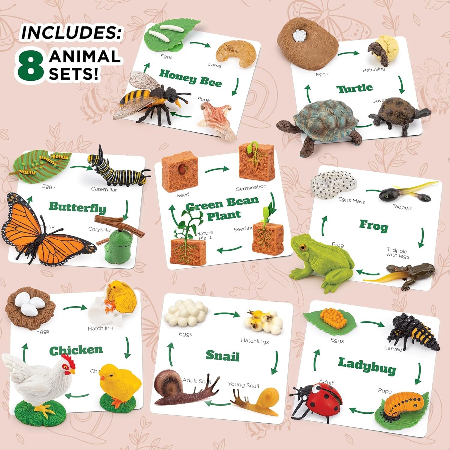 Discover 7 Animal & Plant Life Cycles Includes butterfly, frog, chicken, bee, ladybug, turtle, snail, and plant stages. This 32-piece kit combines 3D figurines and matching cards to help kids explore biology and sequencing through hands-on learning.
