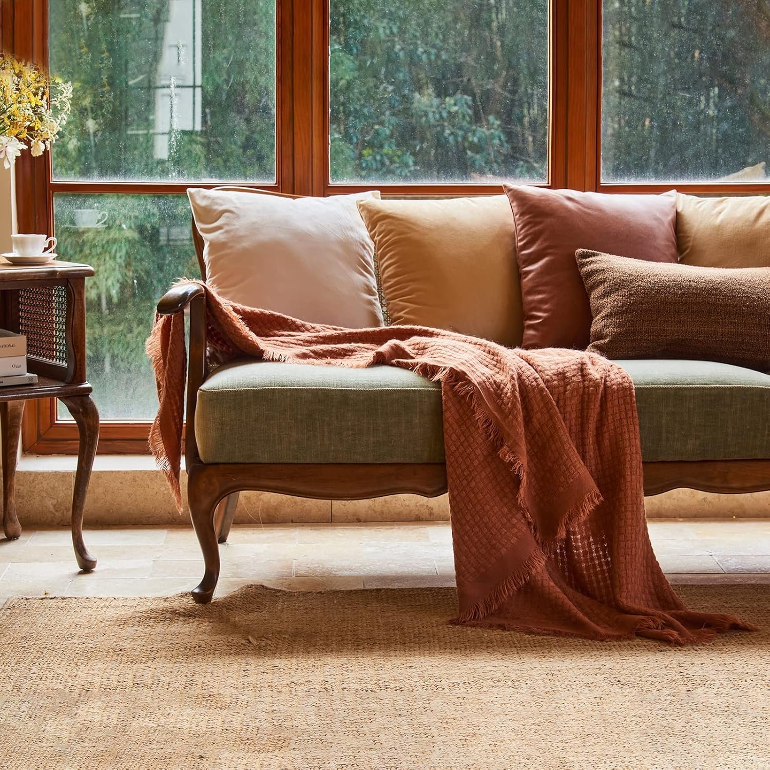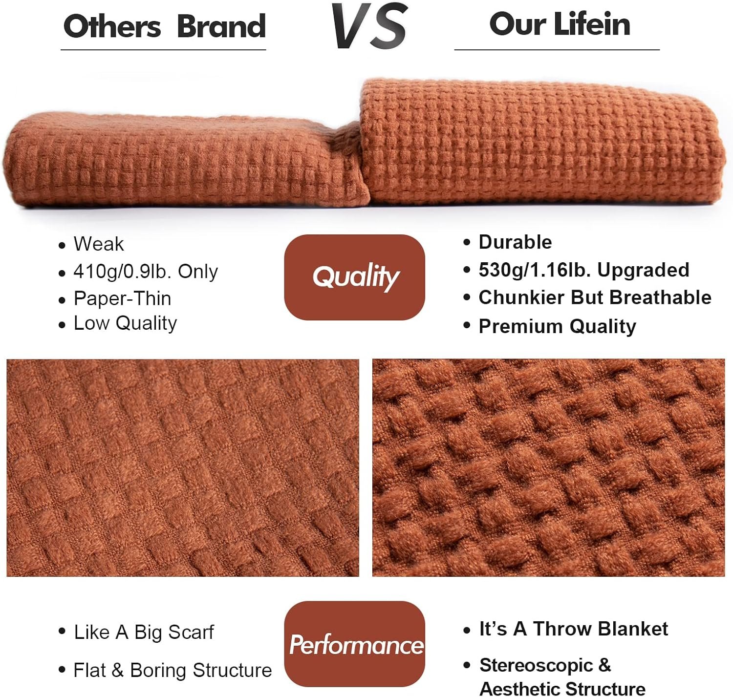 【FANTASTICAL DESGIN】LIFEIN throw blanket for couch nicely raised waffle textured knit design and well-arranged rustic farmhouse style fringes, this knitted throw blanket is in kinda terracotta/burnt orange rust, which is a pretty easy way to match your room to add an extra solid terracotta boho feature, don’t you want have a burnt orange rust throw blanket or a terracotta throw blanket for your home decor?