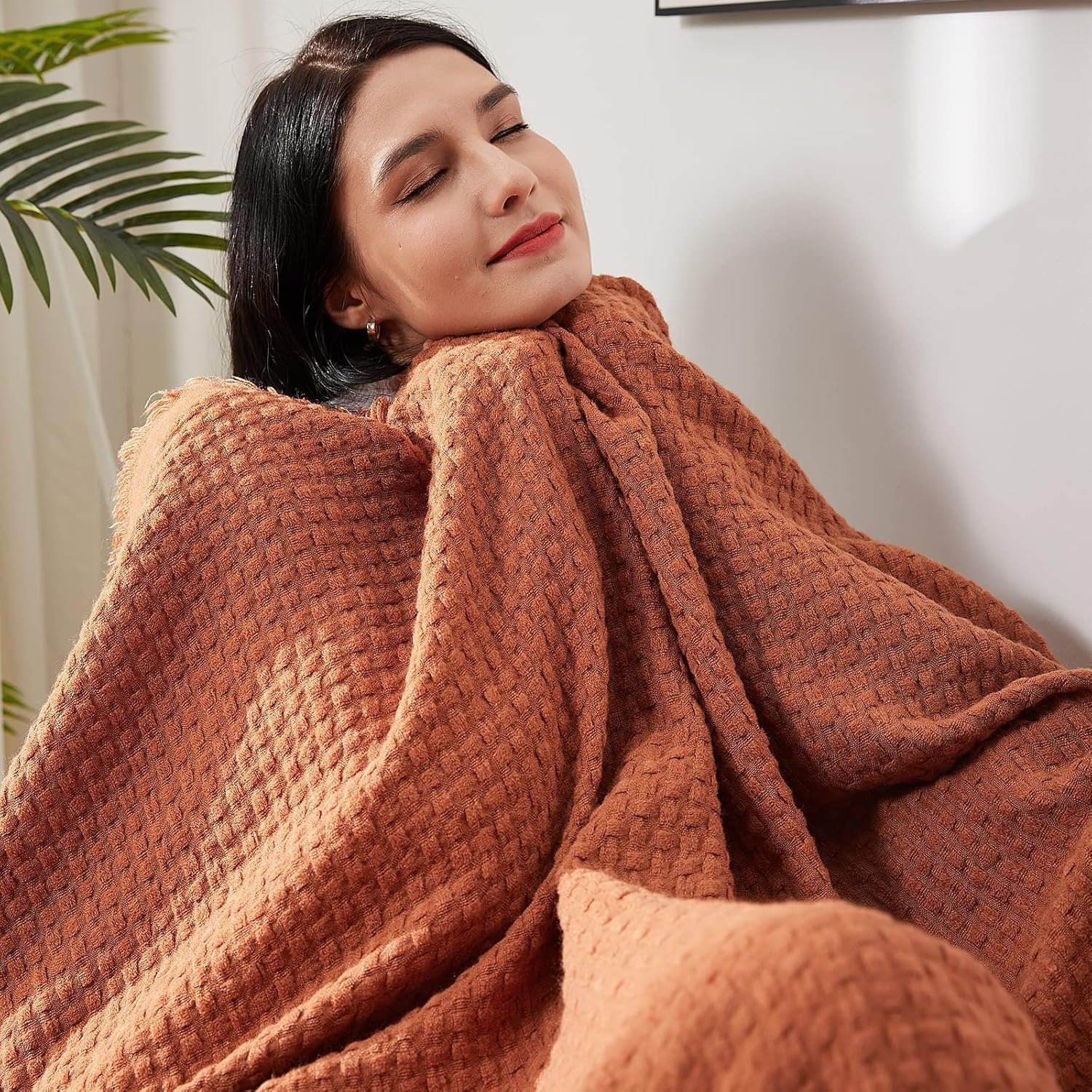 【ALL SEASON USE】LIFEIN couch throw blanket is your ideal choice for spring throw blanket, its farmhouse style match blooming spring perfectly.In summer it turns to be a cooling summer blanket, its lightweight & breathable keep you warm in A/C room. Having this caramel rust throw blanket in autumn is always so elegant, what a dream fall throw blanket! As a winter throw ,it nimbly be a shawl or scarf to warm you up outdoors, don’t you want such a soft throw blanket?