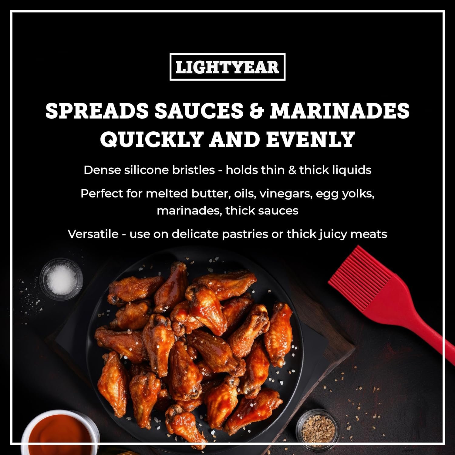 [ SPREADS SAUCES AND MARINADES QUICKLY AND EVENLY ] Lightyear’s dense silicone bristles absorb both thick and thin liquids for more effective basting. This means you get an even spread of your marinade, ensuring that every inch of your food is infused with flavour. Perfect for melted butter, oils, vinegars, egg yolks, and juicy meat marinade.