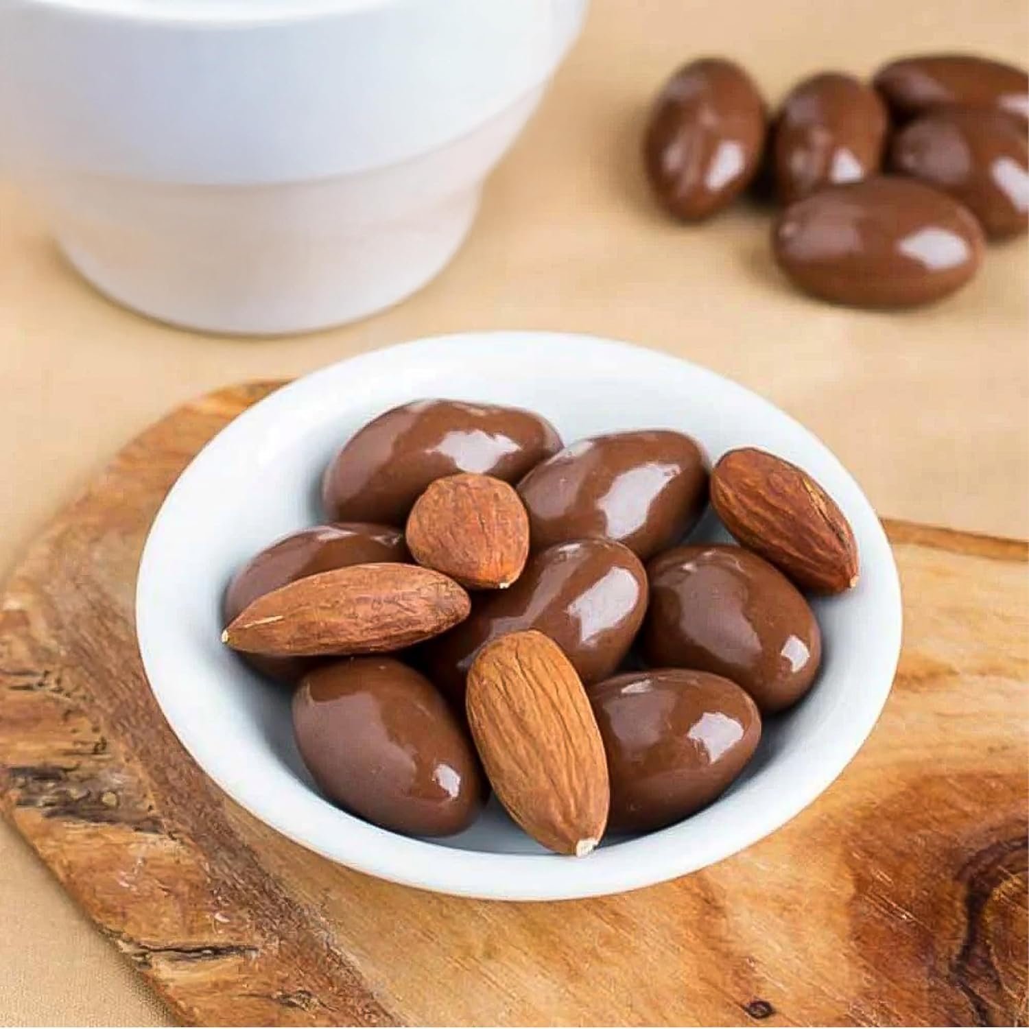 PREMIUM CHOCOLATE-STYLE ALMOND SNACK Indulge in crunchy almonds coated in rich milk chocolate style coating made with 40% cocoa. This premium snack offers a satisfying blend of sweet and nutty flavors.