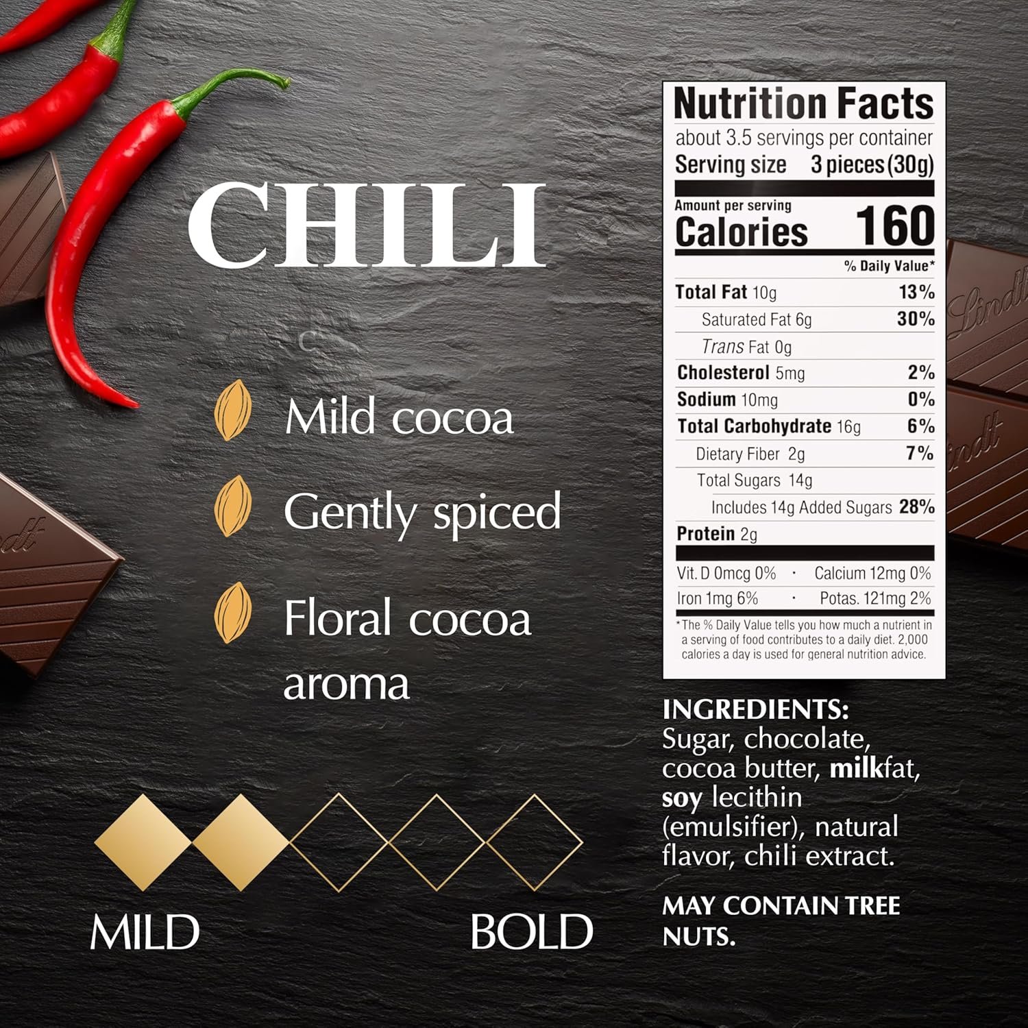 Aromatic dark chocolate combined with the spicy flavor of red chili