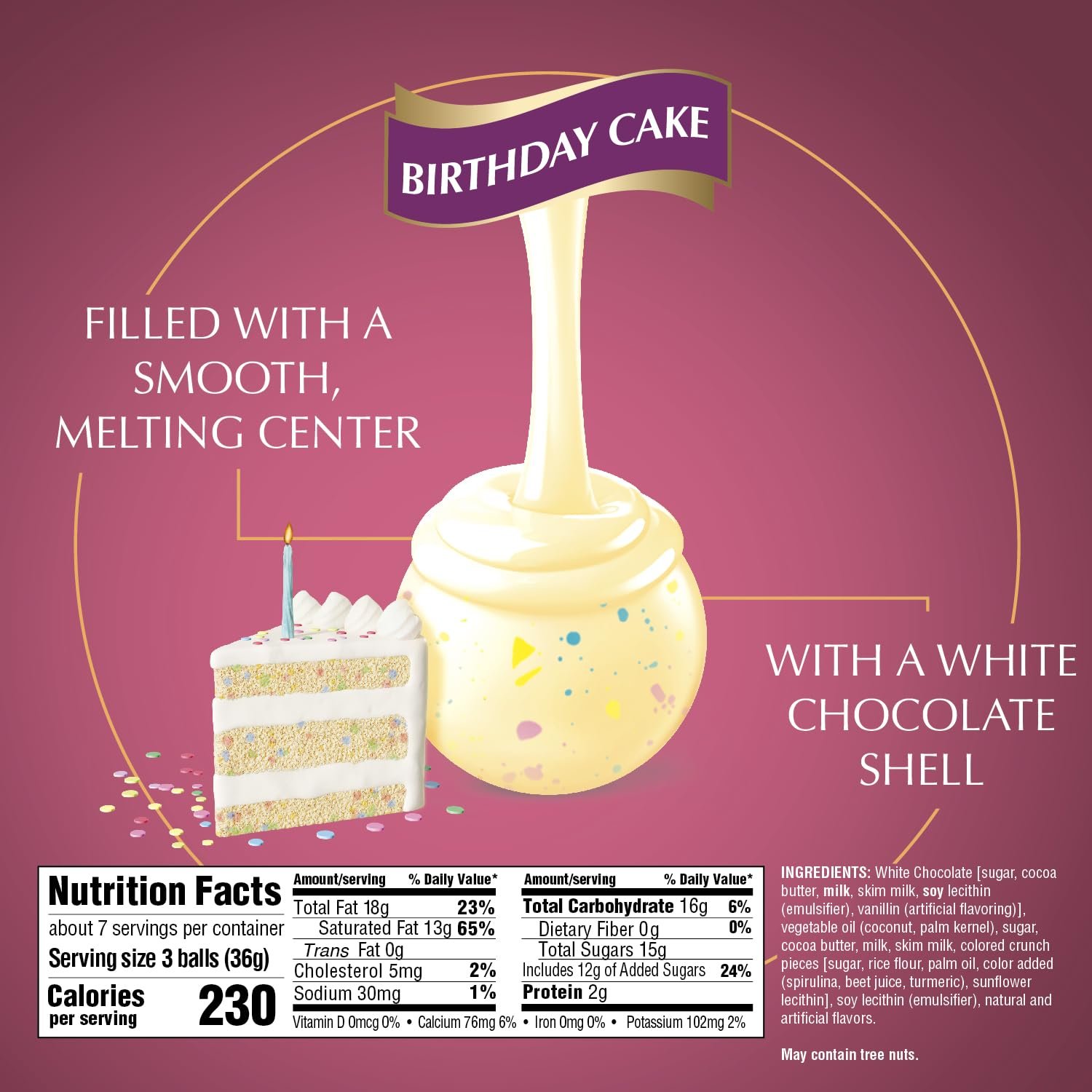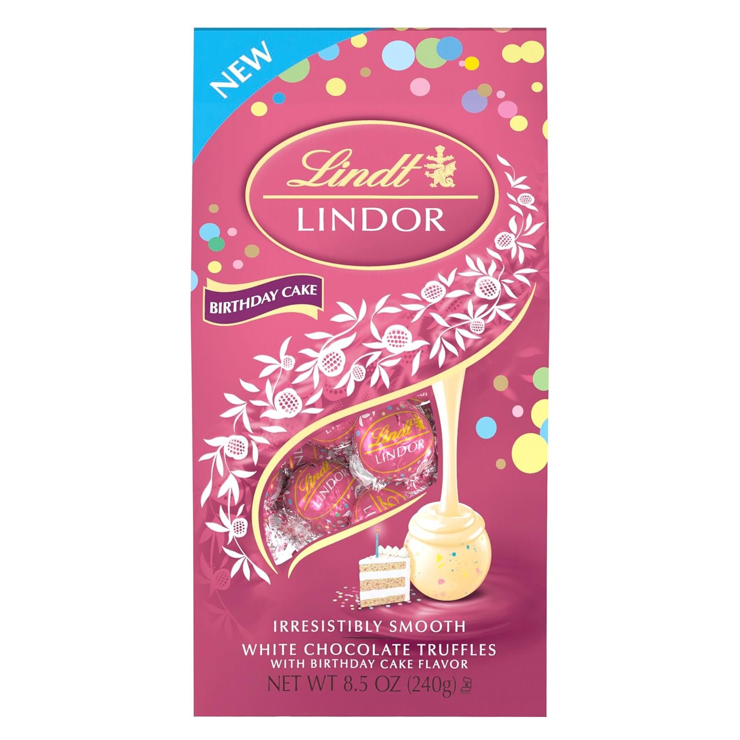 White chocolate LINDOR truffles feature delicate white chocolate shells and smooth birthday cake flavored truffle filling