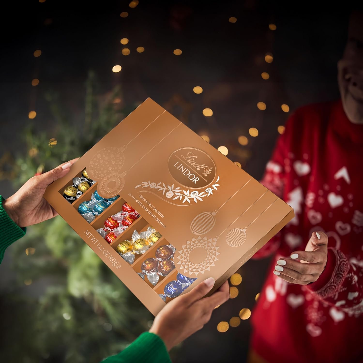 Our seasonal limited-edition LINDOR Deluxe Gift Box features an assortment of six, individually-wrapped truffle flavors; assortment includes: Milk, Dark, White, 60% Extra Dark, Fudge Swirl, and Sea Salt Chocolate Truffles