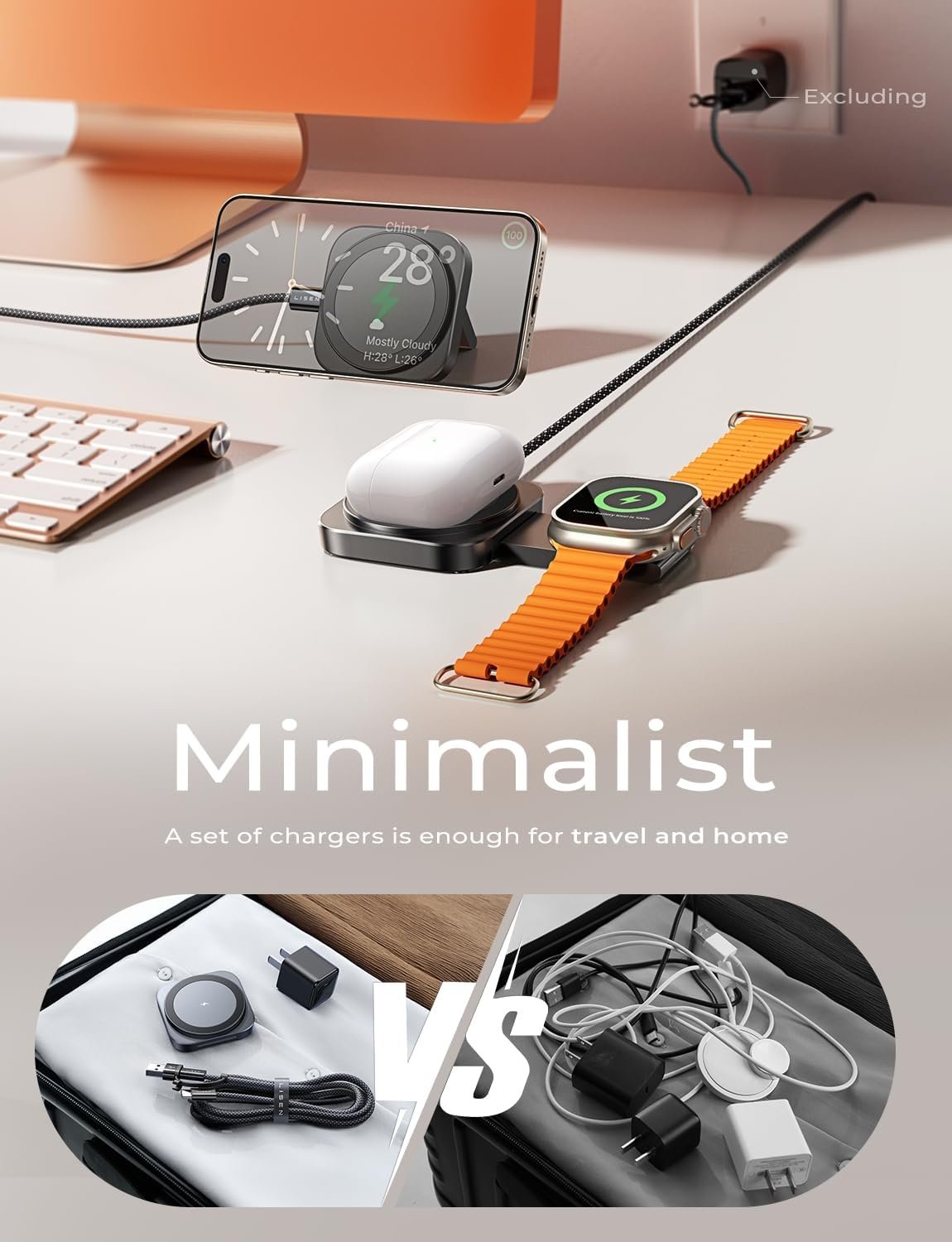 Friendly Reminder: This product is a 3-in-1 charger for iPhone, watches,and AirPods, not a portable power bank. The so-called wireless charger refers to an inductive charging connection with the iPhone, It’s not that cables and power supply are not needed.Its convenience lies in one charging head and one wire replacing the conventional three sets of chargers. Essential for travel. And the phone can be easily charged by placing it on, so that you won’t forget to charge it during idle time