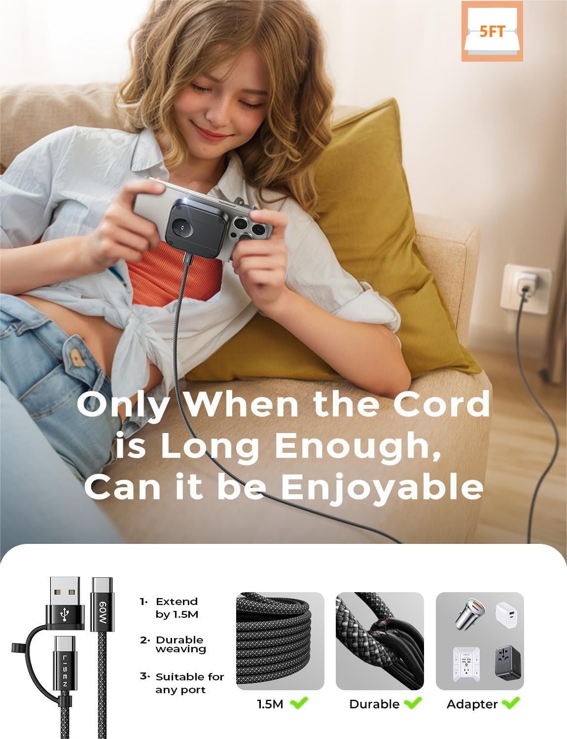 【Comes with a 60W Fast Charging Cable】- This for iPhone magnetic charger includes a high-quality USB A+C to USB-C cable that’s an impressive 1.5 meters long, made with durable nylon braiding and featuring a 60W pure copper core. The 1.5-meter length offers you the freedom to use it in most of your daily situations; the nylon braided material remains intact even when faced with small pets like cats and dogs; the 60W power is compatible with most fast adapters