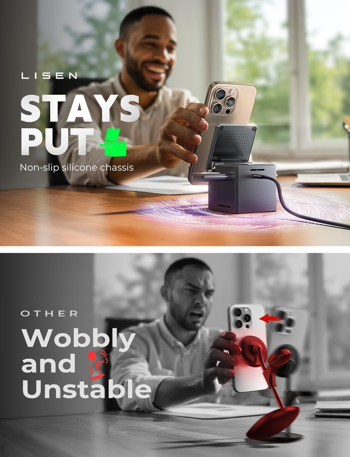 Important Information Before Purchasing: Please note that while the LISEN 3-in-1 portable qi2 masgafe charging station adheres to national standards, its charging speed is slower than wired charging. However, LISEN ensure that its charging rate is not inferior to other products on the market, keeping your devices’ batteries healthy before your outings