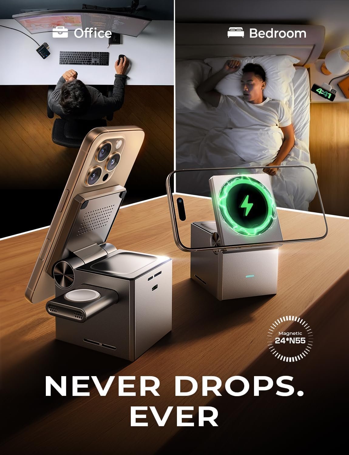 Versatile Usage: Not only does our charging station provide a convenient solution for charging your devices, but it also doubles as an adjustable stand for your iPhone. Whether you prefer to watch videos, make calls, or use your phone in landscape or portrait mode, this charger offers the flexibility you need. The anti-slip design ensures stability and safety while charging