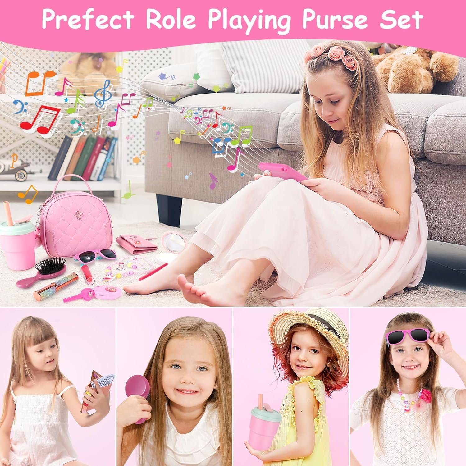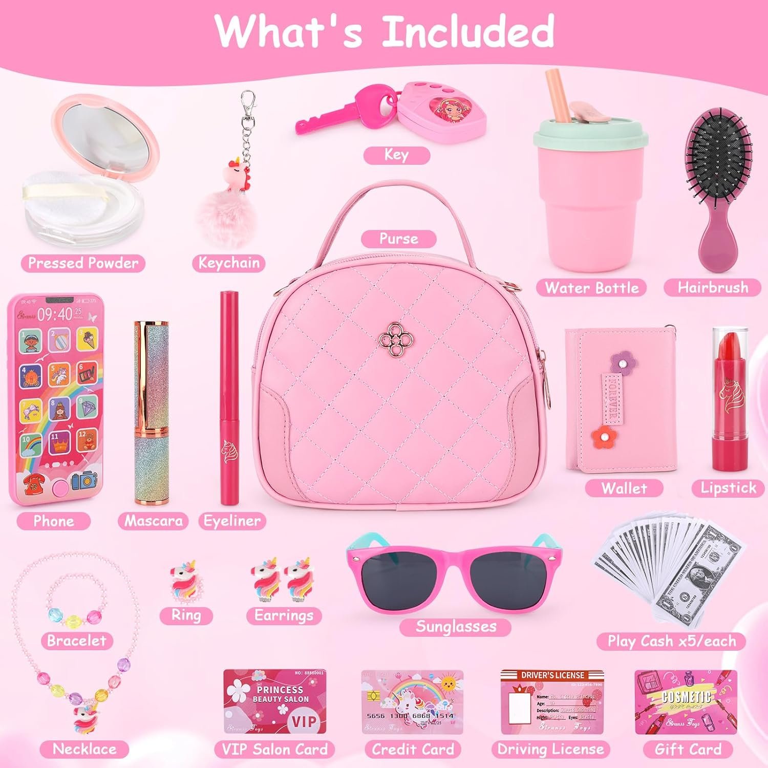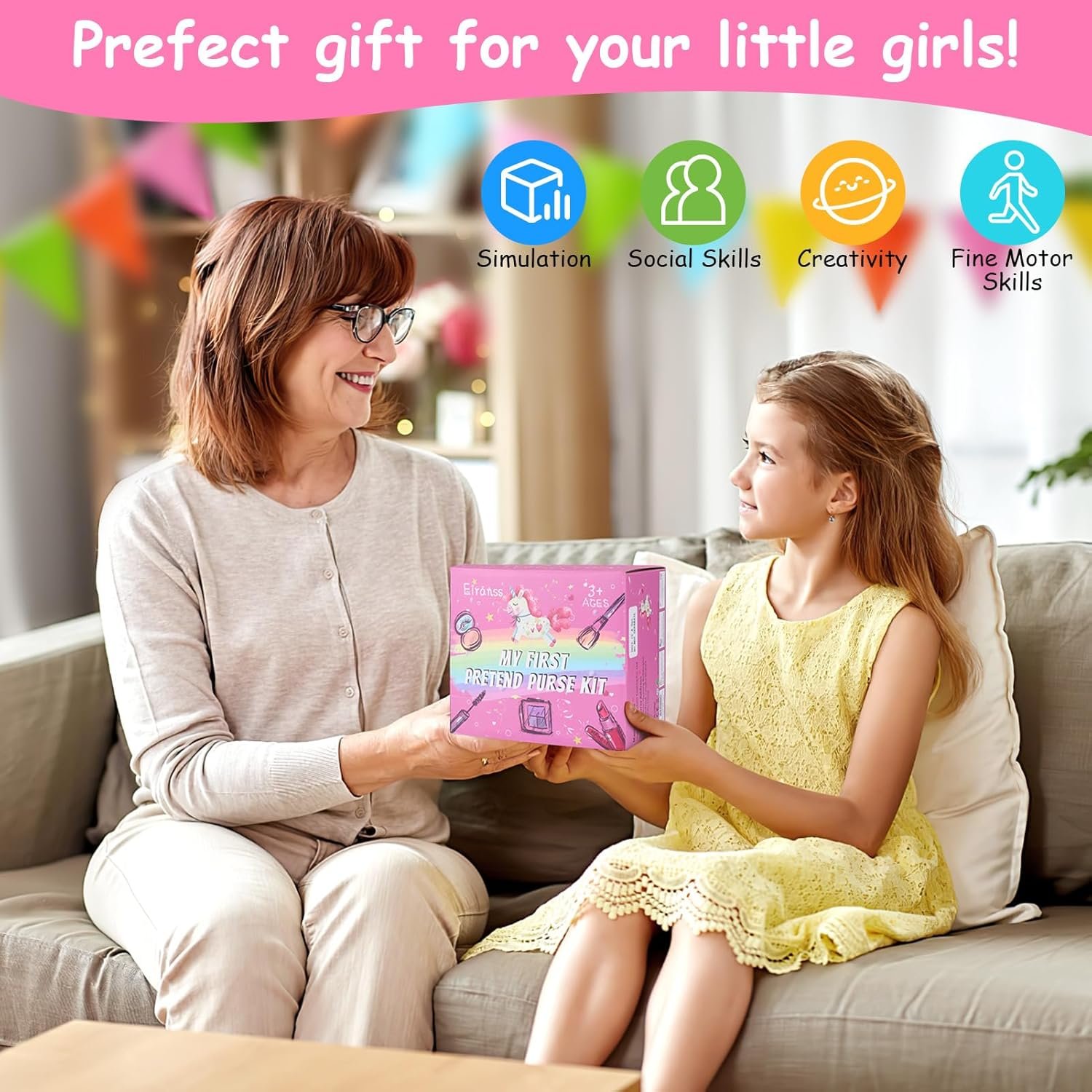 ๐๐๐ ๐๐๐๐๐๐๐๐๐ ๐๐๐๐ ๐๐๐๐๐& ๐๐๐๐๐๐ ๐๐๐- Every little girl dreams of having her own purse like mom! This complete girls toys set includes a little girls purse, wallet with 25 play bills & 4 cards (Driving License, Credit Card, VIP Salon Card, Cosmetics Gift Card), unicorn jewelry set, toy phone with lights/sounds, hairbrush, sunglasses, play key, keychain and play makeup set (lipstick, eyeliner, mascara, foundation). Perfect for imitating mom’s daily routine – from makeup to shopping trips!