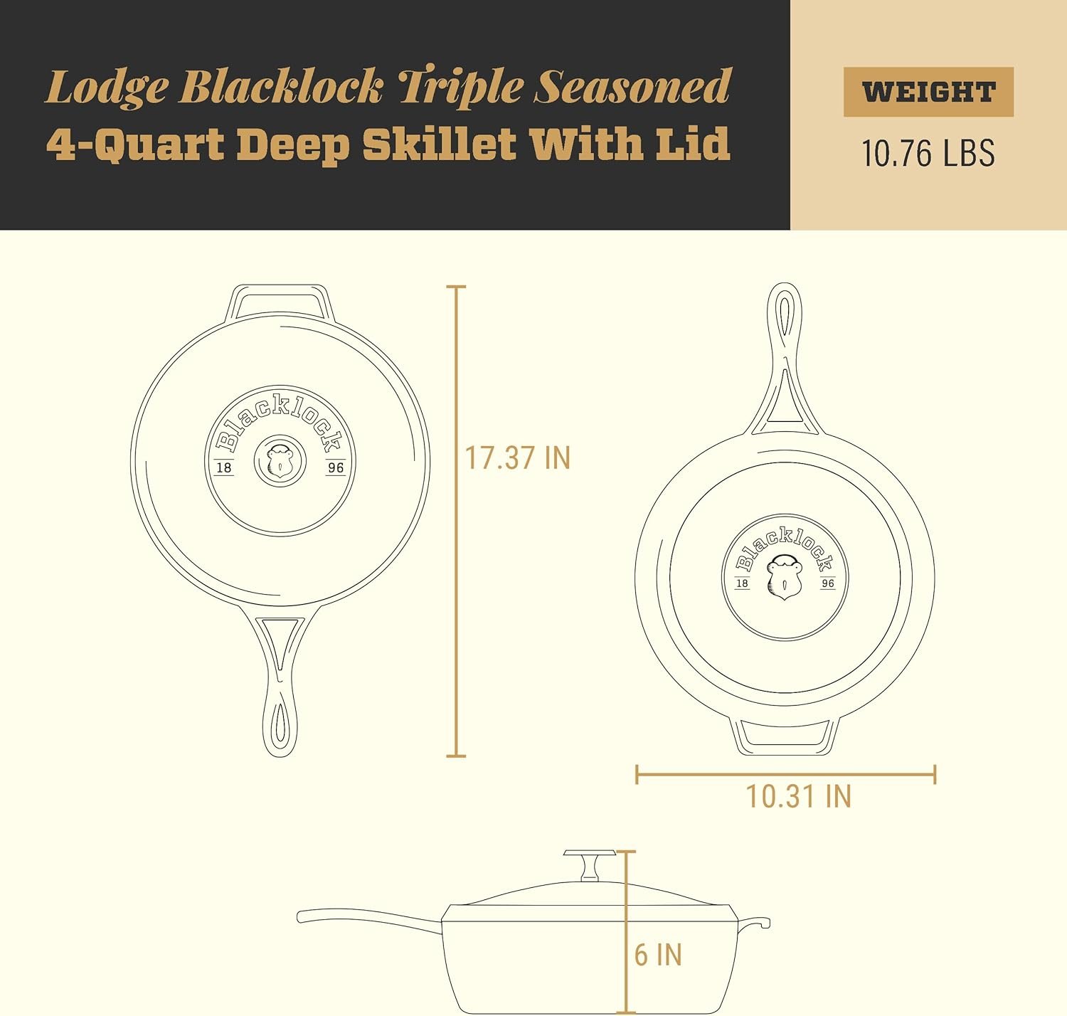 Cast Iron Skillet Pan with Lid: This Blacklock 4 quart deep skillet comes with a cast iron skillet lid that features basting rings, creating tender and heightened flavor