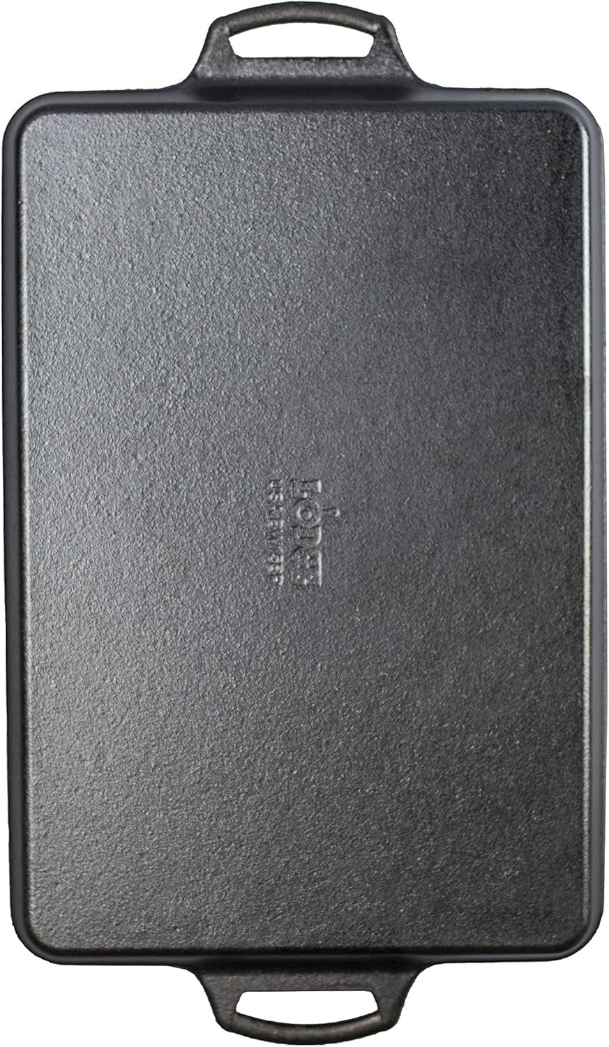 You asked, we answered. The Lodge 15.5 x 10.5 Inch Seasoned Cast Iron Baking Pan has two handles for easy lifting around the kitchen. Its naturally seasoned baking surface won’t dent, bend, or warp in the oven, making it perfect for baking cookies, a jelly roll, and cornstick—and even roasting vegetables. Crafted in America with iron and oil, use this baking pan to cook for generations. It provides excellent heat distribution and retention for consistent, even cooking. Seasoned and ready to use. With our seasoned cast iron bakeware collection it’s easy to make homemade baked goods and casseroles that rival your favorite bakery and restaurants. Each piece our cast iron bakeware features a design that is easy to grip, lift, and move about the kitchen. Made in America with iron and oil, use Lodge bakeware for generations of baking fun.