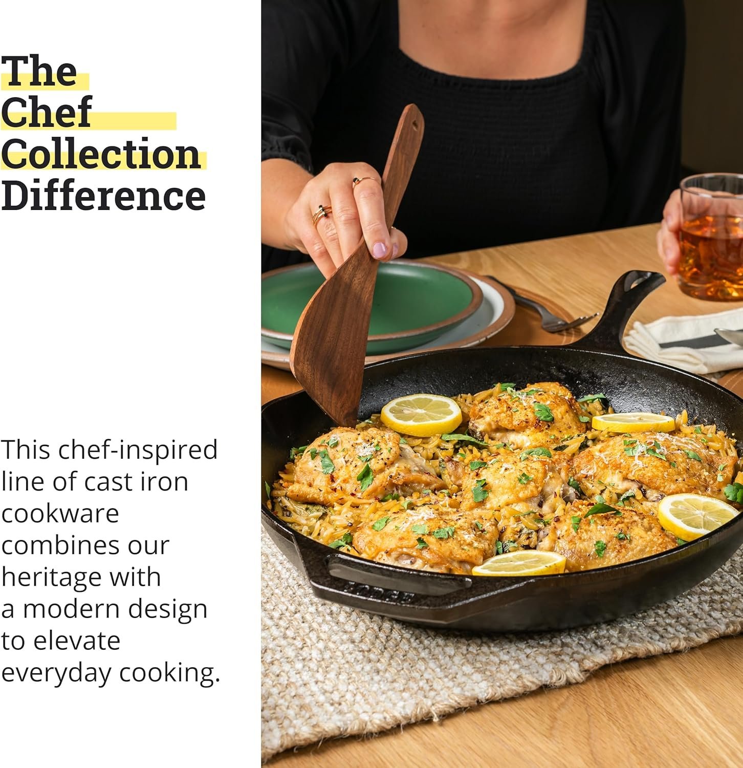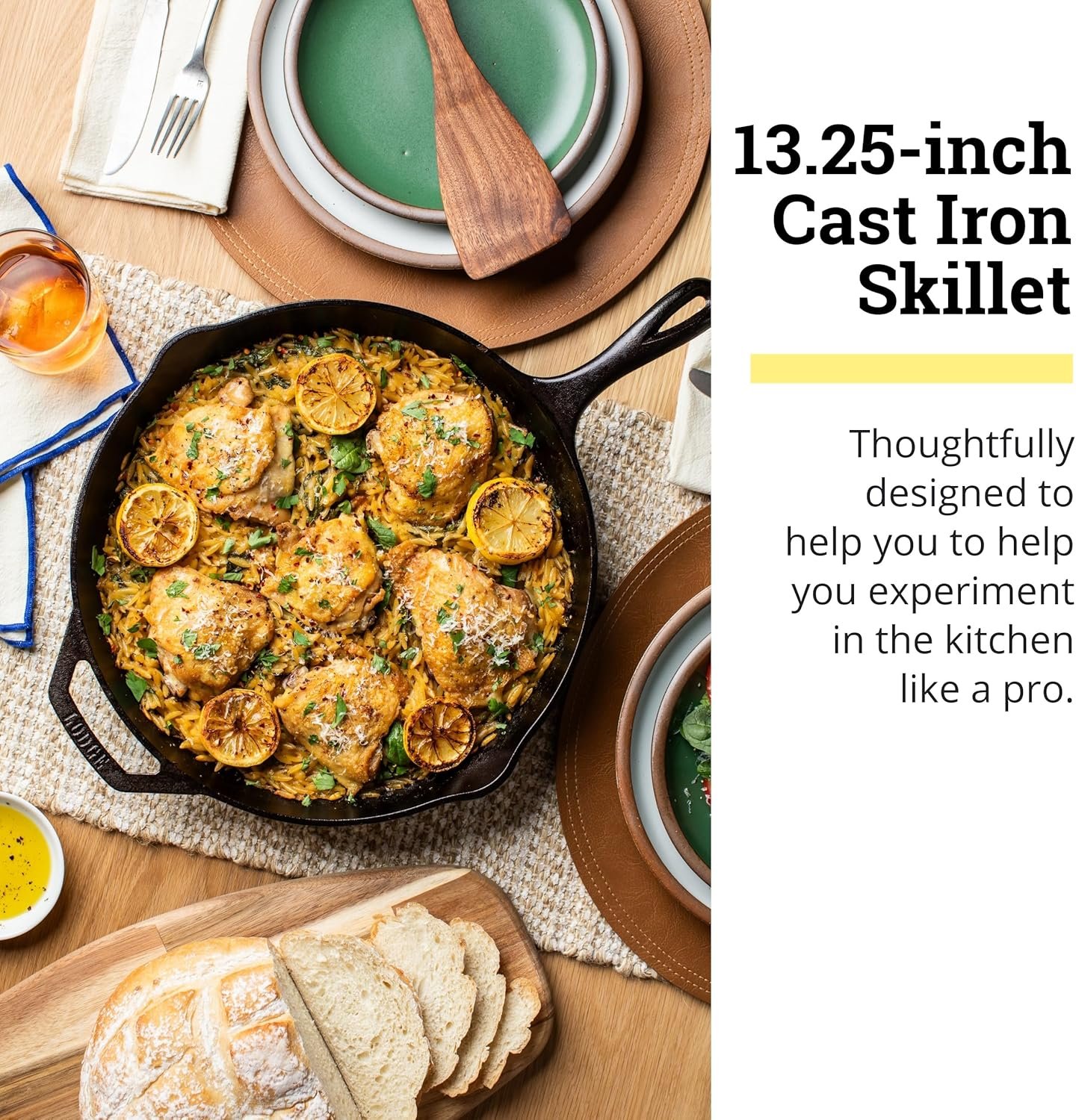 Thoughtfully designed with ergonomic handles, spatula-friendly sidewalls, generous pour spouts, and superior heat retention, this skillet is ready to help you experiment in the kitchen like a pro. Reach for this skillet to make a standing rib roast, roast a chicken, and feed a big table of hungry guests.