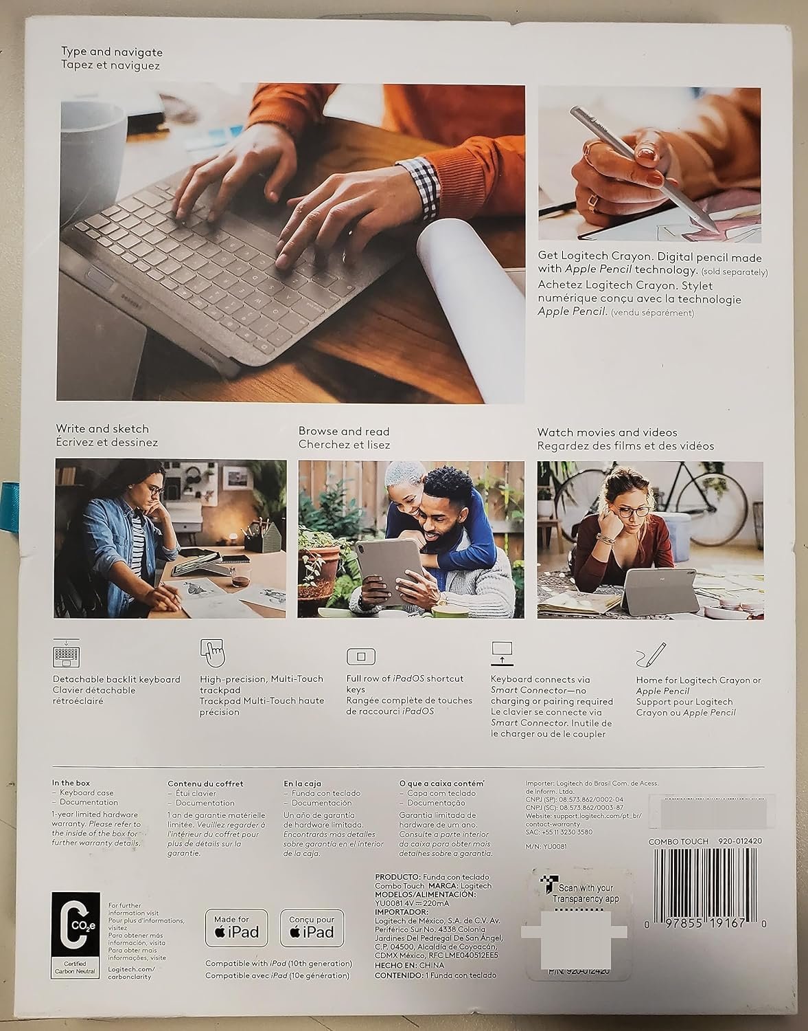 Combo Touch is a keyboard case with detachable keyboard and trackpad for iPad (10th gen) that gives you a versatile new way to use and navigate your mobile device and interact with apps like Notes, Pages, Numbers, and more. Product Details: Height: 7.51 in (190.9 mm) Width: 9.97 in (253.3 mm) Depth: 0.75 in (19.2mm) Weight: 20.17 oz (572 g) Platform Compatibility: iPad (10th gen) Model: A2696, A2757, A2777 4 Modes: Type, View, Sketch, Read Keyboard Type: Detachable keyboard Backlit Keys: Yes (Up to 16 levels of adjustable backlighting) Viewing Angles: Type Mode 60°; Sketch Mode 20° Power and Connectivity: Power by iPad via Smart Connector Space to stow Logitech Crayon or Apple Pencil Front, back and corner protection Access all ports: Camera /USB-C port