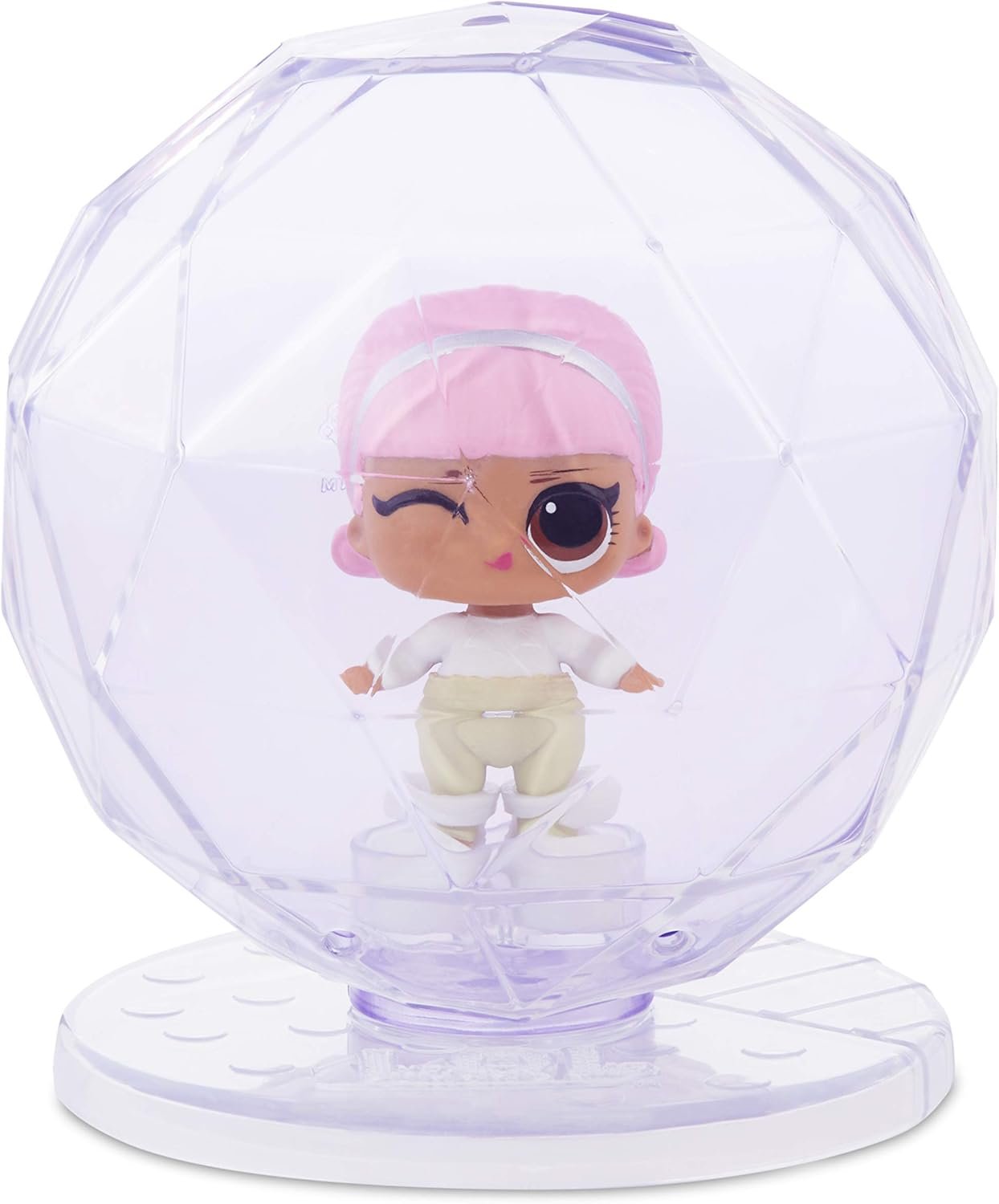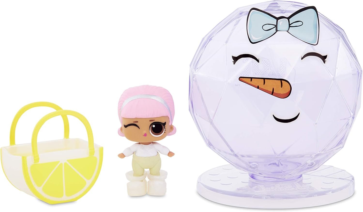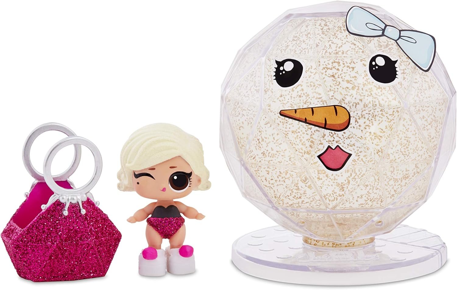 Unbox 5 surprises with L.O.L. Surprise! Lils Winter Disco Series. Will you get a Lil Pet, a Lil Sis, or even a Lil Brother? Lil Pets are now fuzzy, so you wash off the fuzz to unbox your pet. Then add water for a colour change surprise. Each Lil comes packaged in a beautiful, crystal-shaped ball with a clear front to use as a display case. Use the included stickers to decorate the ball to make the face of a Snow B.B. Collect L.O.L. Surprise! Glitter Globe dolls, Fluffy Pets, and Lils in the Winter Disco Series, and you can connect the balls together to create a beautiful Snow B.B. Collect them all! Styles may vary.