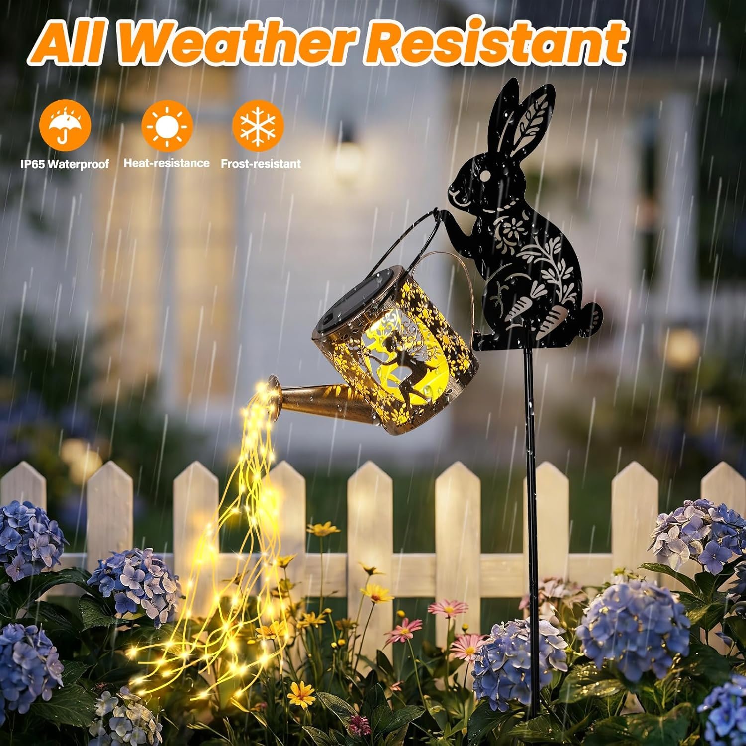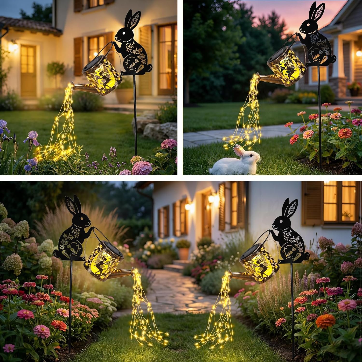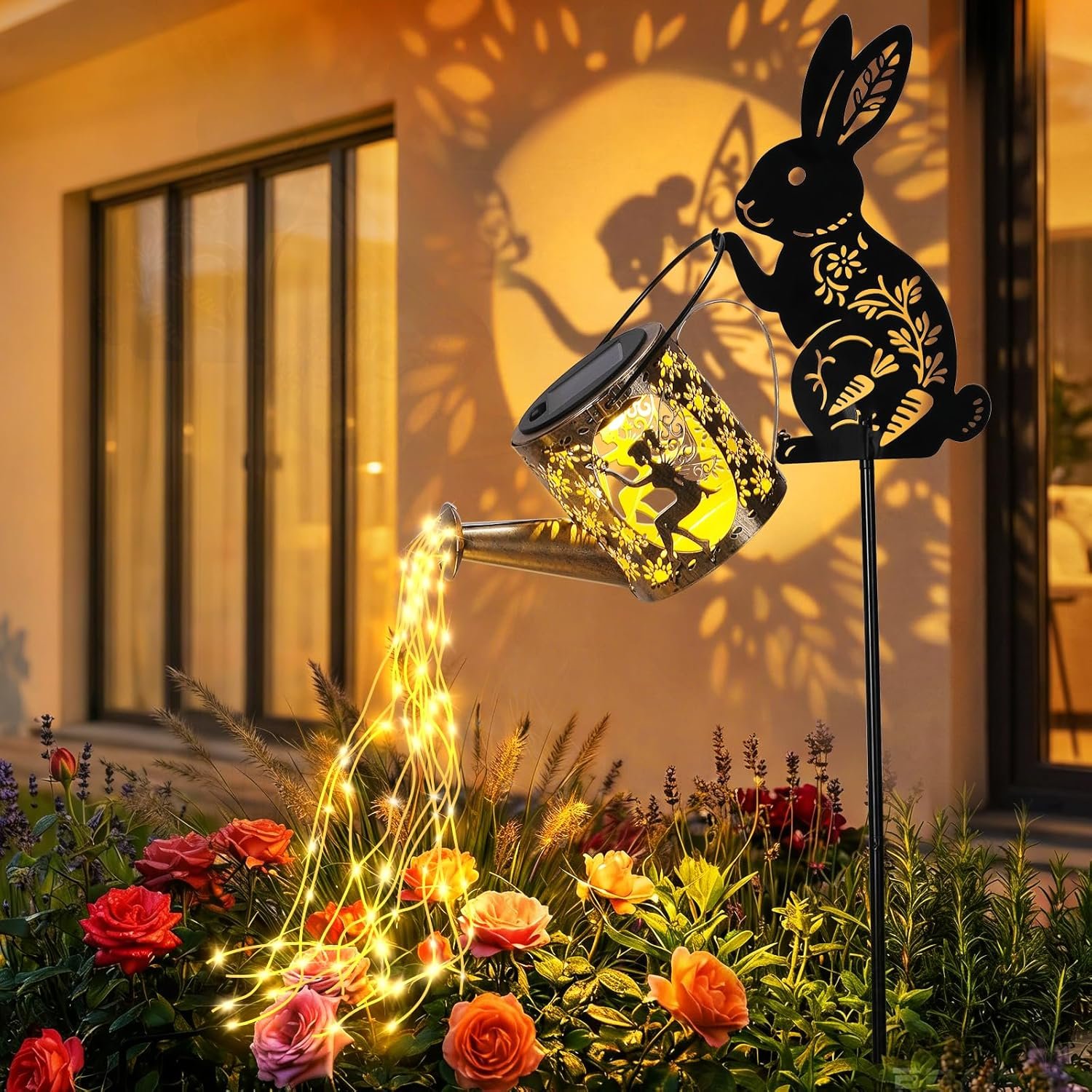 Cute Rabbit with Solar Watering Can Light: This charming garden statue features a detailed rabbit holding a lovely solar watering can lantern. It emits a warm, welcoming, flickering flame-like glow at night, instantly creating a magical atmosphere in your outdoor space.