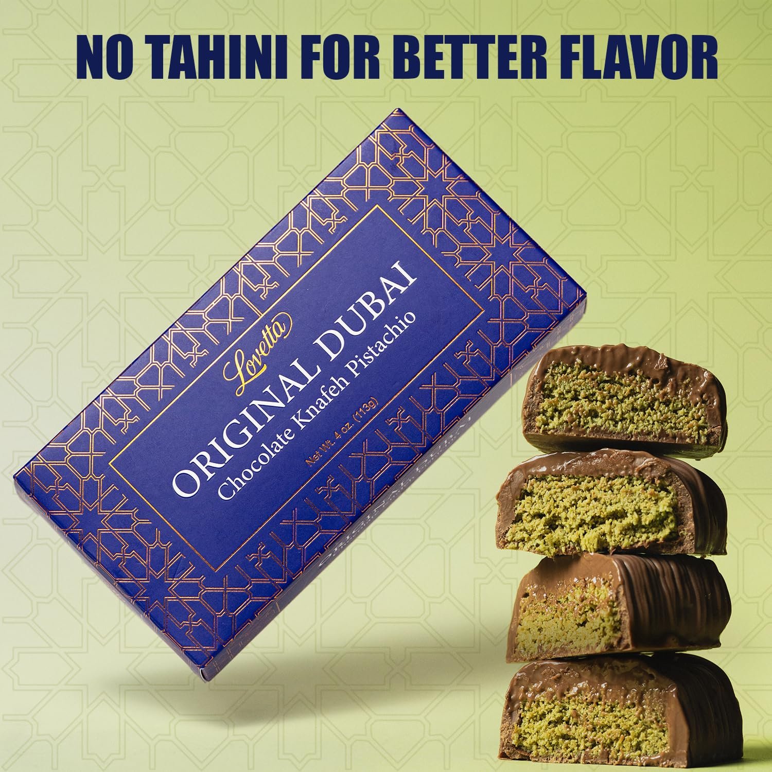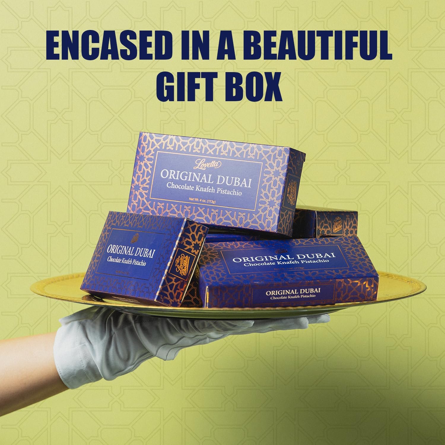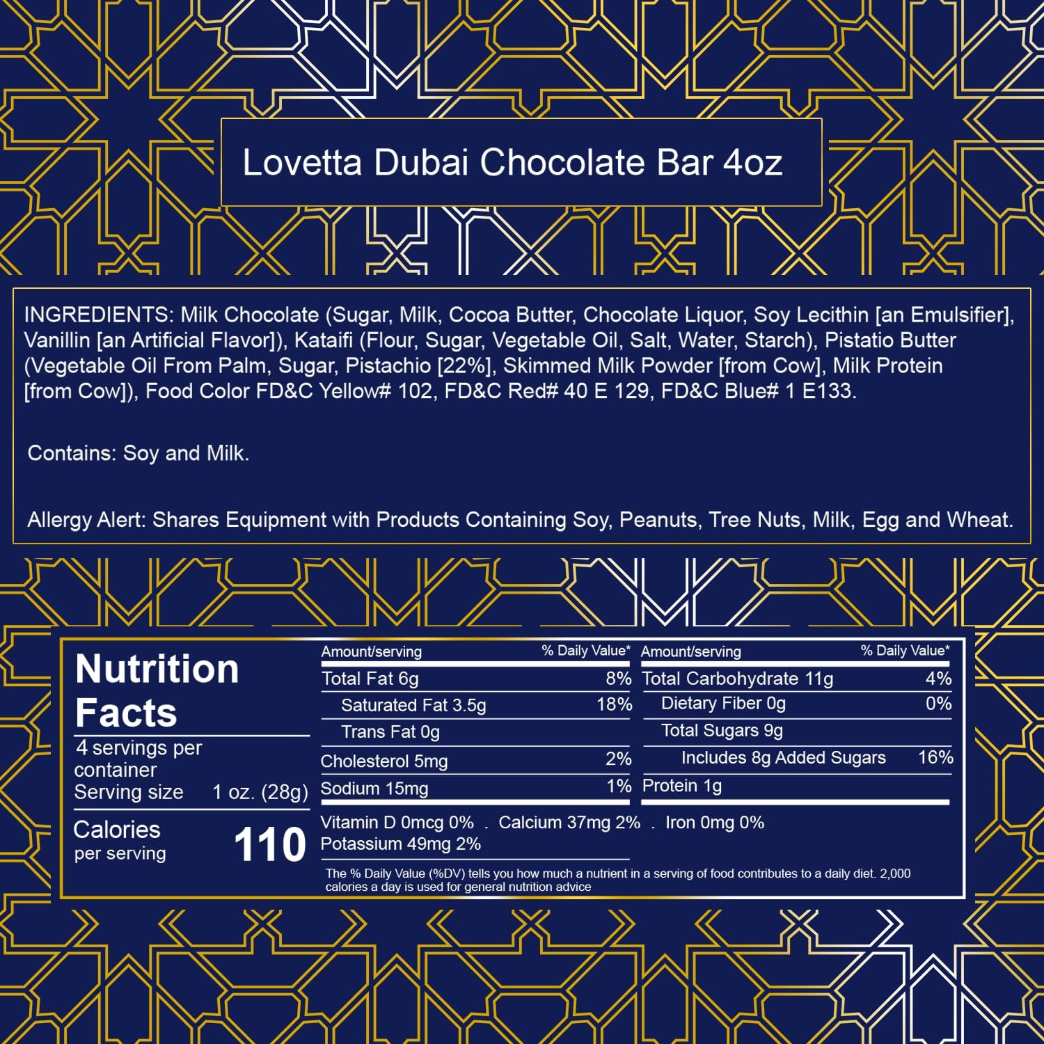 Indulge in the exquisite Lovetta Dubai Chocolate Bar Pistachio Knafeh, where luxury meets tradition. Each bar is crafted from rich milk chocolate and filled with a premium blend of fresh pistachio paste cream and traditional knafeh, creating a perfect harmony of flavors and textures. Individually wrapped for ultimate freshness, these belgian bars are ideal for on-the-go enjoyment or as a decadent treat for special occasions. Elevate your chocolate experience with the opulence of Dubai in every bite. Enjoy our viral Lovetta Dubai Chocolate bar