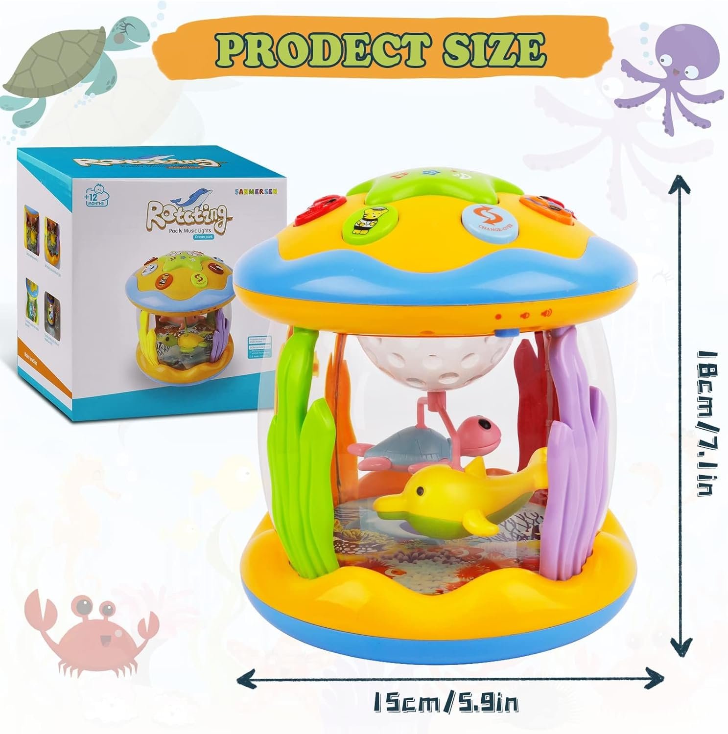 Baby Toys for 6-18 Months: Ocean rotating lights up musical toys designed for babies 6 9 12 18 months. This interactive baby toy features 360° rotating dolphins and turtles with 8 types of colorful lights, simulating the underwater world. Just turn on the switch to make it play music, animal sounds and light the colorful lights.