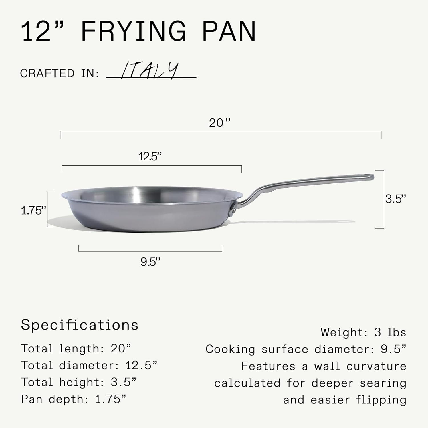 Total Diameter: 12.5” | Cooking Surface Diameter: 9.5″ | Height (with handle): 3.5” | Depth: 1.75” | Length including handle: 20″