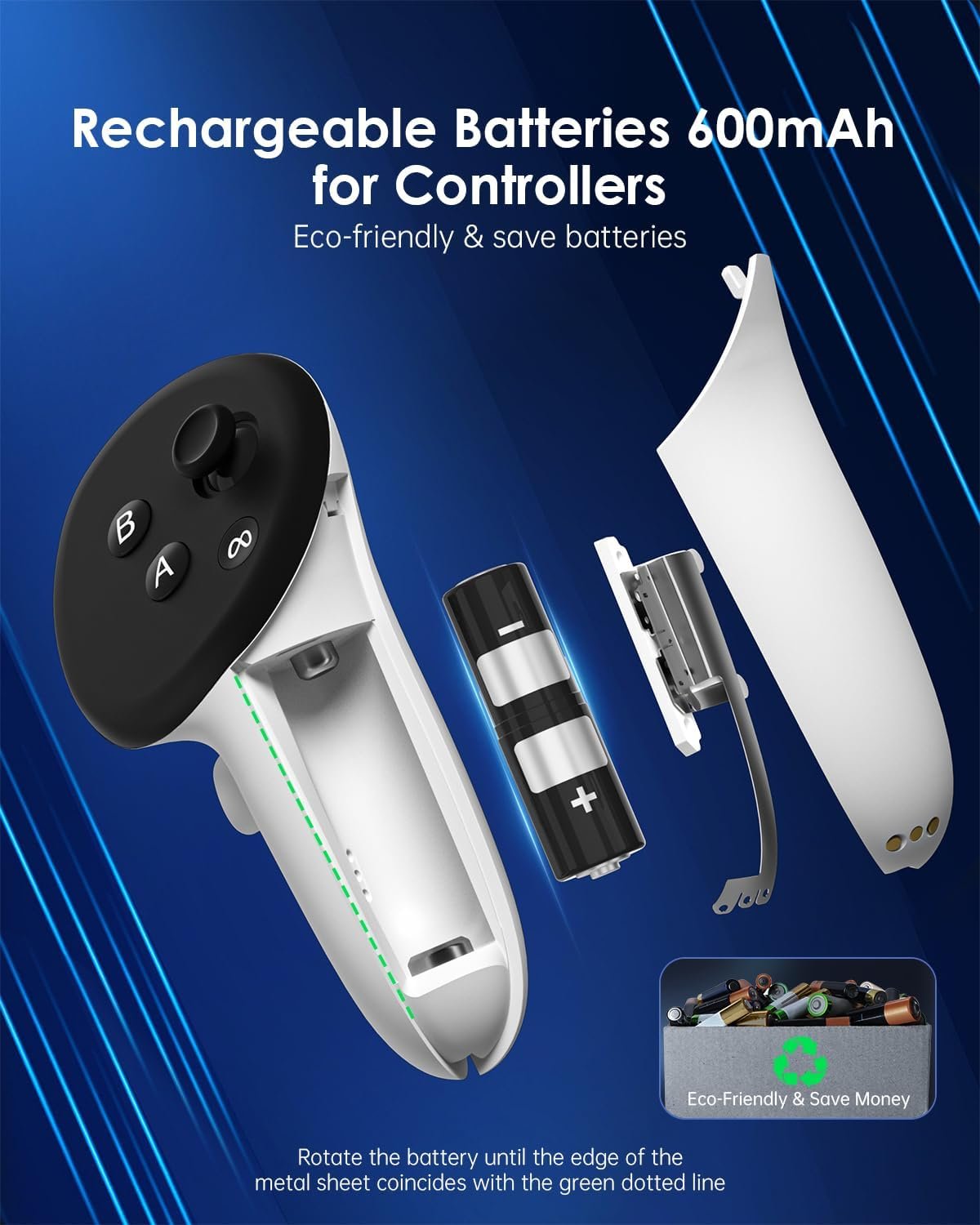 Display up to 80% power in system: Due to the characteristics of rechargeable batteries, but fully charged actually. Includes 600mAh rechargeable batteries for controllers, designed for sustainability and reduced waste. Packing: 1 Charging dock for quest 3, 2 Rechargeable batteries, 2 Controller battery cover, 2 USB C to C cables, 1 Adaptor (20W), 1 User Maual.