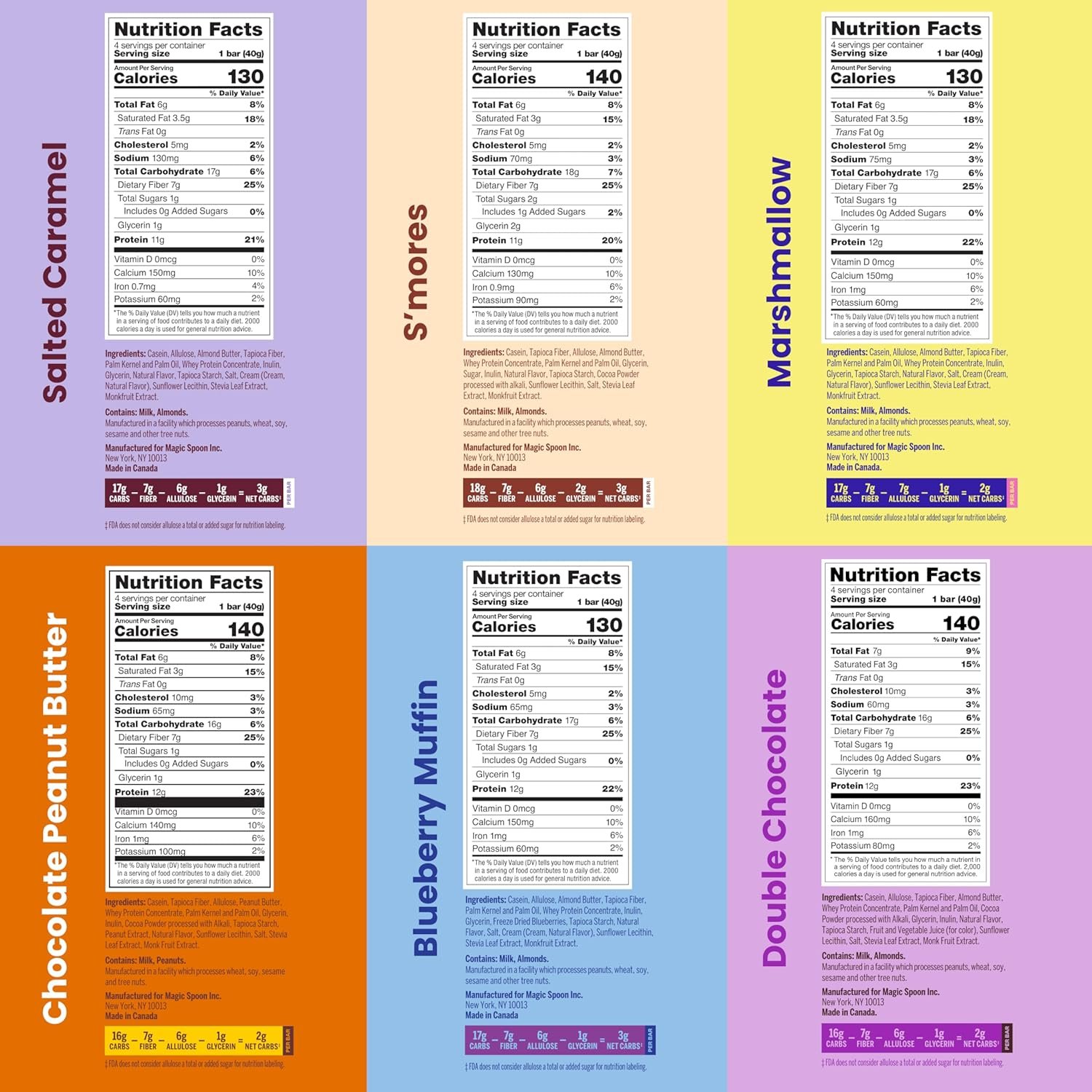 ABOUT MAGIC SPOON TREATS: Magic Spoon treats taste like your favorite protein bars, but with a modern, healthy twist – high protein, low sugar, and wholesome crunch in every bite. A smart choice for those looking for a gluten free protein bar and healthy snacks for adults. This includes 24 protein bars: Salted Caramel (4), Smores (4), Marshmallow (4), Chocolate Peanut Butter (4), Blueberry Muffin (4), and Double Chocolate (4).