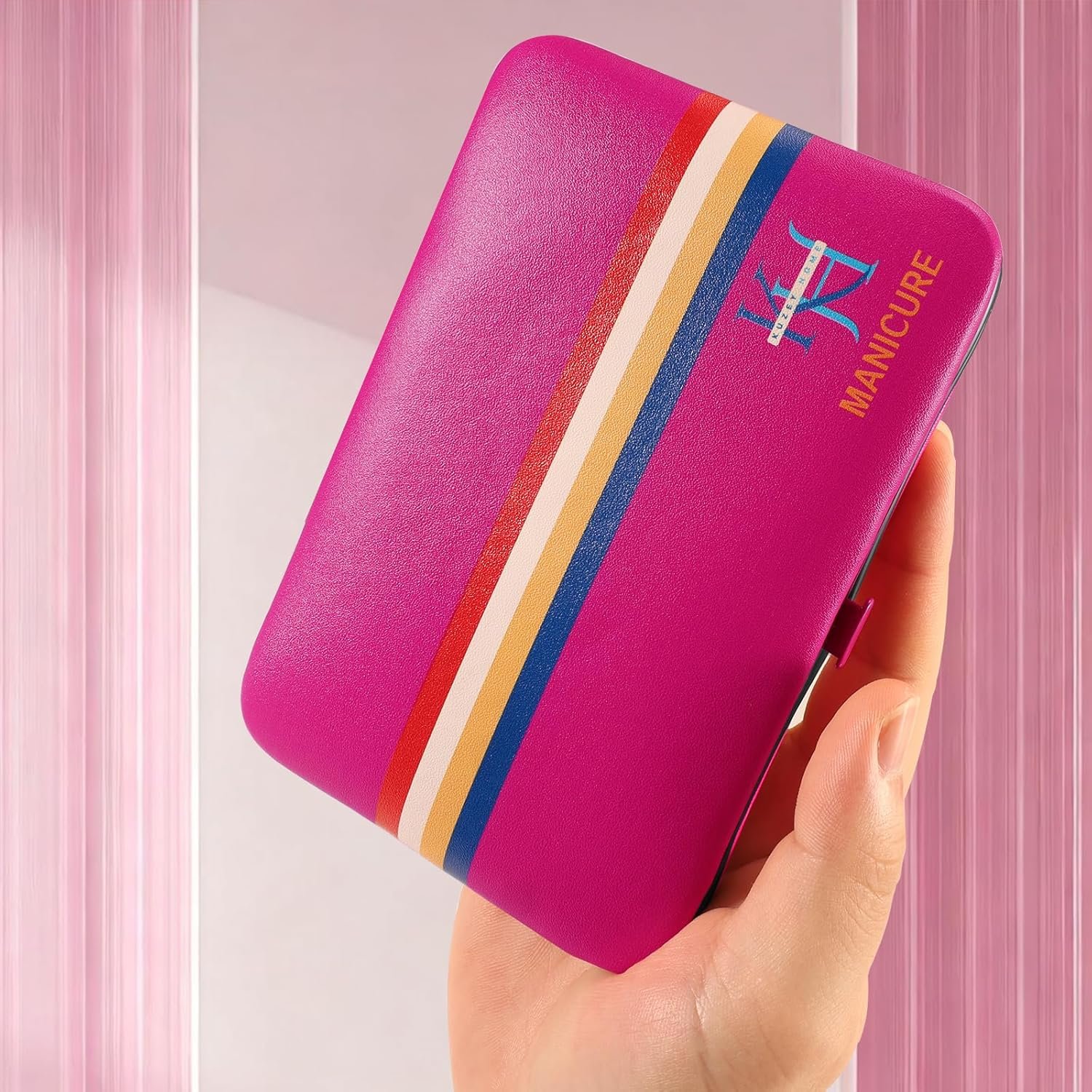 Elevate your personal grooming routine with this professional-grade manicure set featuring premium stainless steel tools. The comprehensive kit includes precision scissors, nail clippers, cuticle tools, and various grooming implements – all housed in a sleek case with distinctive stripe detailing. Each tool is crafted with high-strength stainless steel for lasting durability and enhanced with a non-slip rubber coating for superior grip and control. The thoughtfully designed case keeps tools organized and protected while offering easy portability. Perfect for both home use and travel, this manicure set combines functionality with sophisticated style. The water-ripple textured case adds a touch of luxury while ensuring your grooming essentials stay secure and readily accessible. Whether maintaining your daily grooming routine or preparing for special occasions, this manicure set delivers professional-quality results.