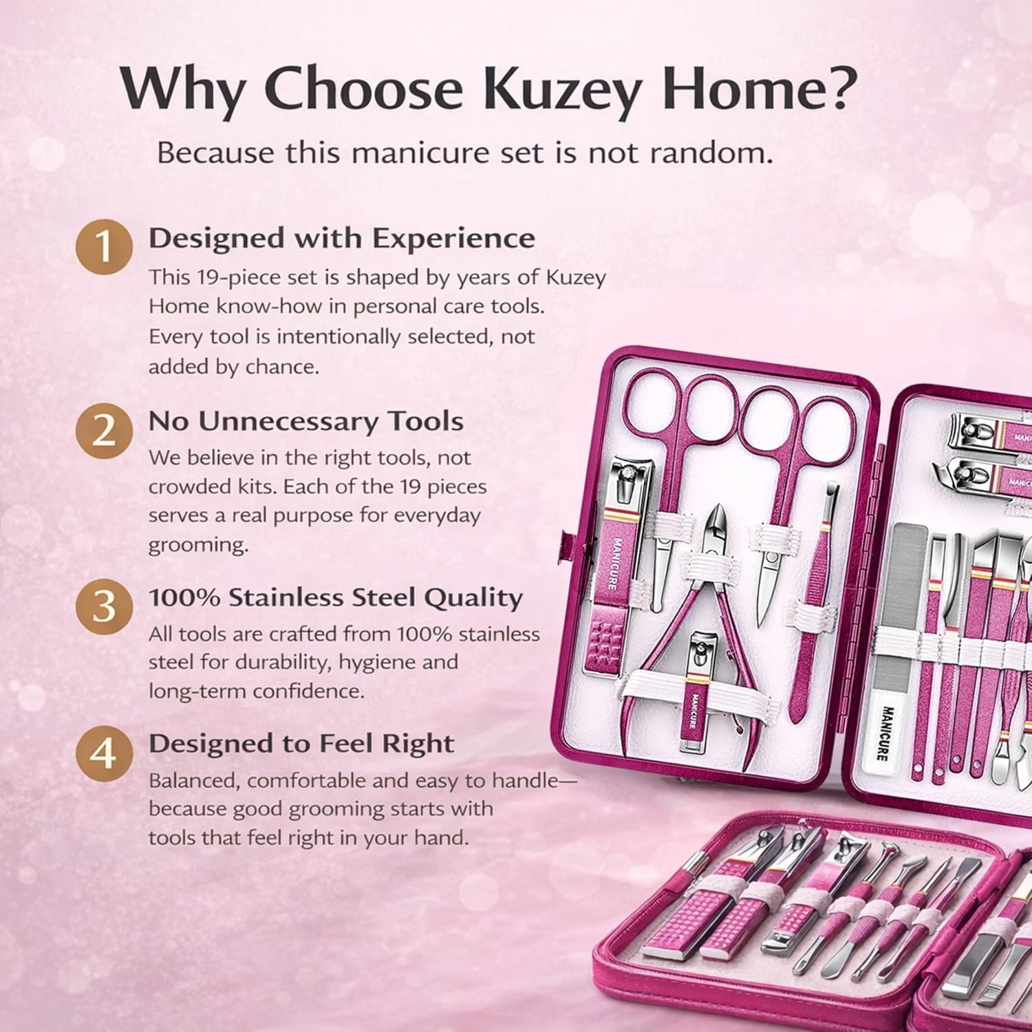 🥇 More Than a Manicure Set – 19 Carefully Selected Tools by Kuzey Home This is not an ordinary manicure kit. It is a 19-piece grooming set designed and produced by Kuzey Home, shaped by years of experience in personal care tools. Each of the 19 tools is intentionally chosen to deliver balance, comfort and professional-level grooming—nothing random, nothing unnecessary.