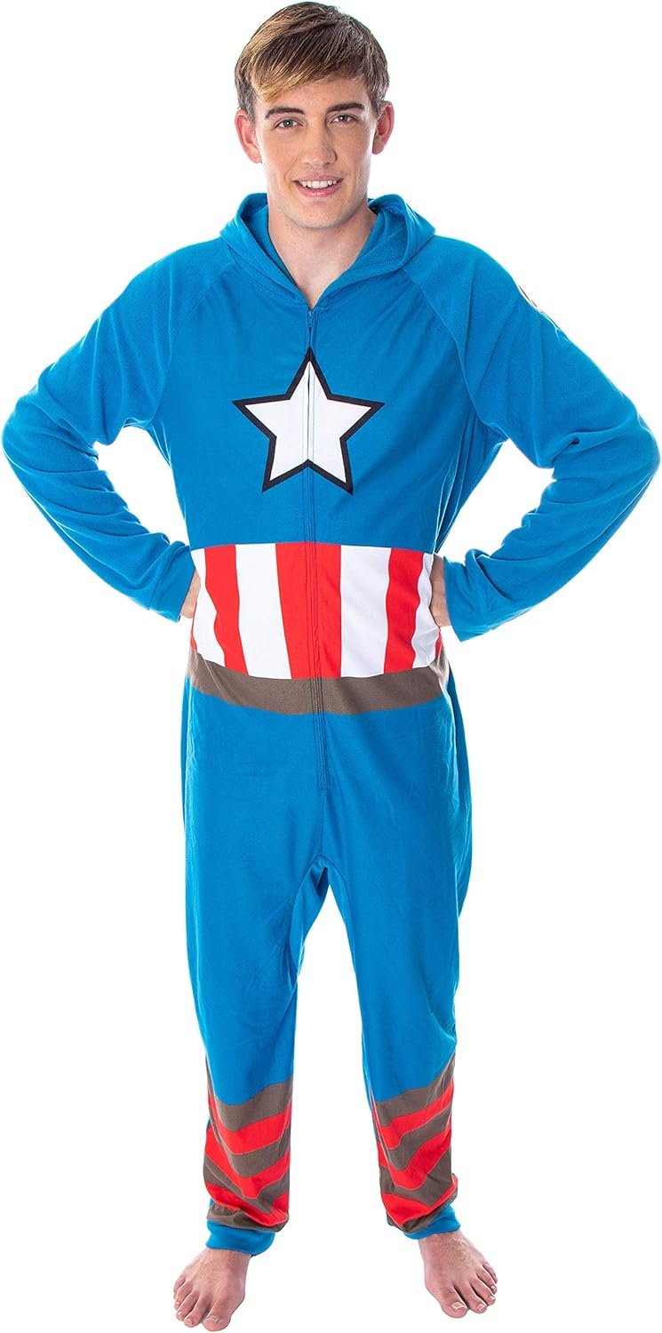 Marvel Comics is the worlds leading producer of comic books, comic films, and superhero merchandise. With incredible superhero teams, heroes, and villains, how could you not be a fan?!?! Captain America is one of those incredible superheroes that inspire us to be the best people we can be. This Captain America costume union suit features a classic blue color scheme with a front costume design that consists of a star, red and white stripes with a brown bar underneath to look like a belt, and red and brown lines on the front legs for Caps boots. Some of the other unique designs it features are an embroidered Avengers logo at each shoulder and a back with a large shield logo with embroidery as the outlines. The functional hood features a large “A” logo on front, embroidered Wing designs on each side, and eye holes. It has a full waist-to-neck zipper closure. These costume union suits are each made of an ultra-soft 100% microfleece polyester These are the best!