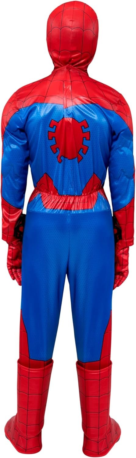 Look out: here comes the Spider-Man Youth Costume. Muscle jumpsuit inspired by Peter Parker’s classic Spider suit. Features printed design and polyfill stuffing in the chest and arms. Includes gloves and full fabric headpiece to complete the suit. Officially licensed Marvel product from Jazwares.