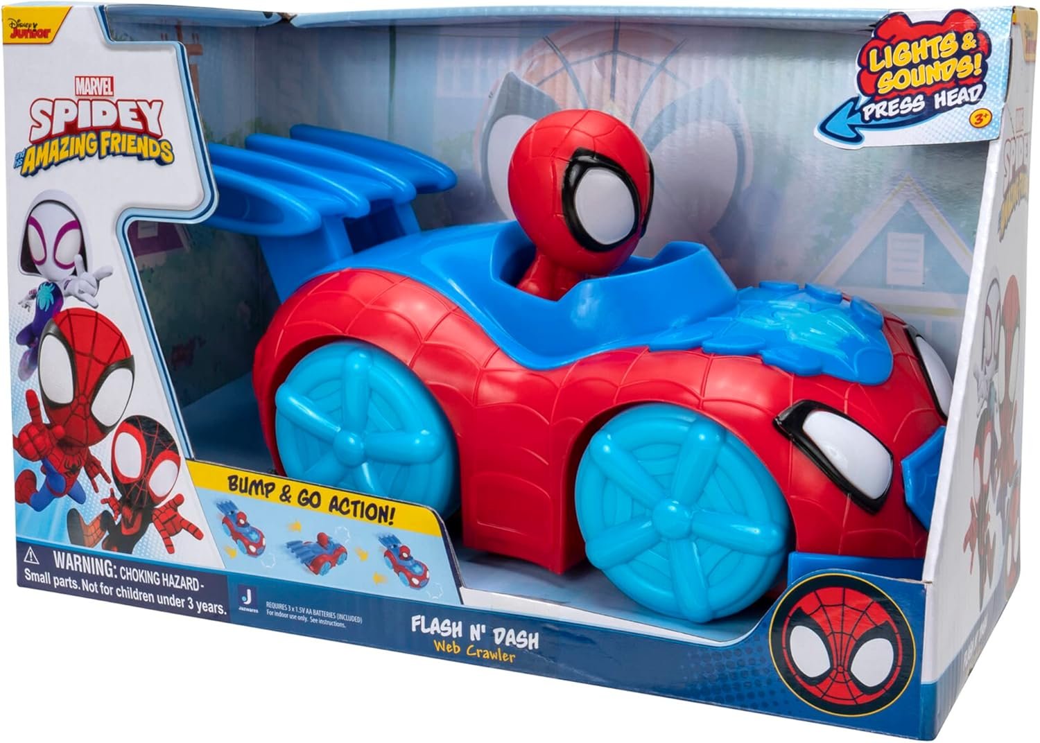 Look out: here comes Spidey and his motorized Flash ‘N’ Dash Web Crawler. This battery operated 9-inch vehicle features lights, sounds, and the ability to roll on its own. Press down Spidey’s head once to activate the Web Crawler. Its hood emblem, tail lights and headlights will pulsate as engine sounds roar to life. Press it again and the Web Crawler will propel itself into adventure. Whenever it bumps into an object, it will automatically back up, spin around, and roll in a new direction. When the action is over, the Web Crawler will power down once it comes to a full stop. Collect this vehicle and more Marvel’s Spidey and His Amazing Friends toys.