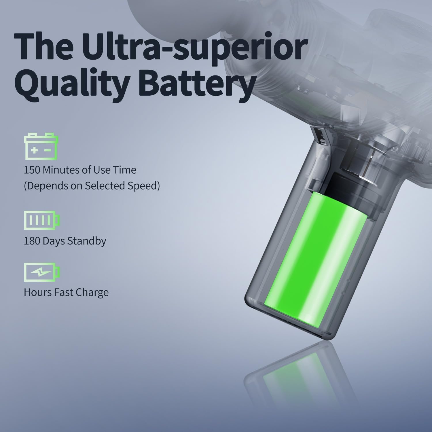 Leercon massage gun is equipped with a powerful 1500 mAh lithium battery. It has a USB charging cable (charging plug not included) for 150 minutes of continuous use (depending on the selected speed). The deep tissue massager will automatically stop running after 15 minutes of constant use. Provide considerate protection for your health and effectively protect battery life.