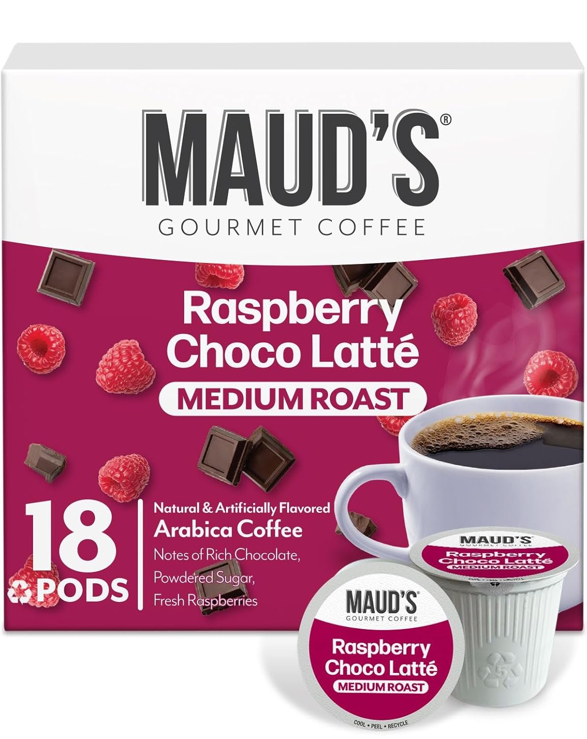 [Flavorful Raspberry Chocolate Blend]: Maud’s “Raspberry Choco Latte” Flavored Coffee Pods deliver the sweet tang of raspberries blended perfectly with the rich irresistible flavor of silky smooth chocolate, dusted with powdered sugar and blended to make the perfect raspberry chocolate flavored medium roast coffee pods.