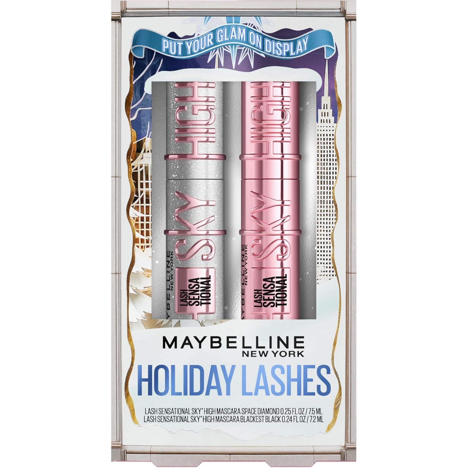 Sky High Duo Holiday Kit: Get ready to dazzle at every celebration! The limited edition makeup set includes 1 full sized Sky High Mascara in Blackest Black washable mascara and 1 full-size Sky High Space Diamond Glitter Mascara