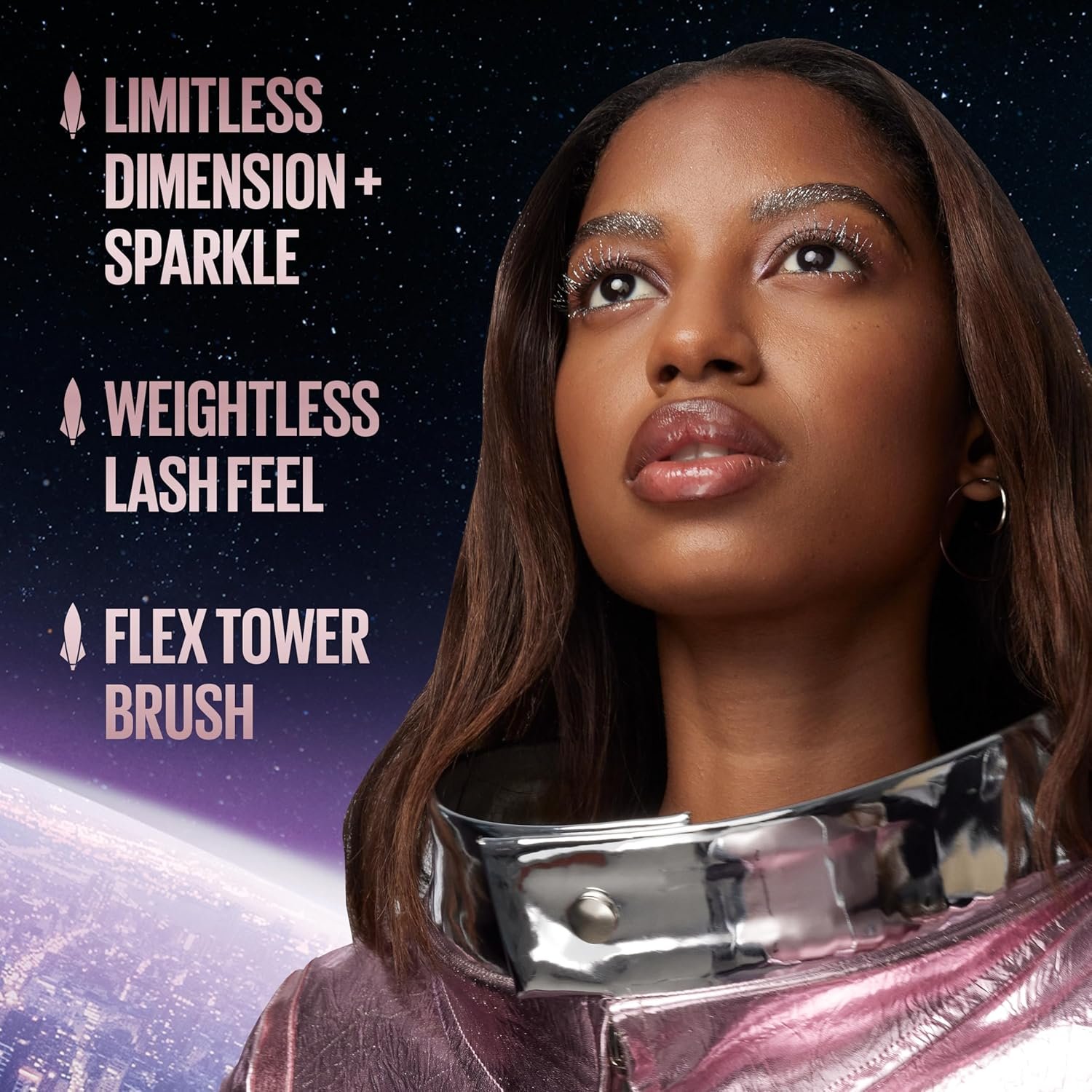 Festive Lash Sparkle: Lash Sensational Sky High Space Diamond Glitter Mascara gives limitless lash sparkle, and beyond. Layer Sky High Space Diamond over Sky High Blackest Black for lashes so lengthened and gleaming, they’re out of this world