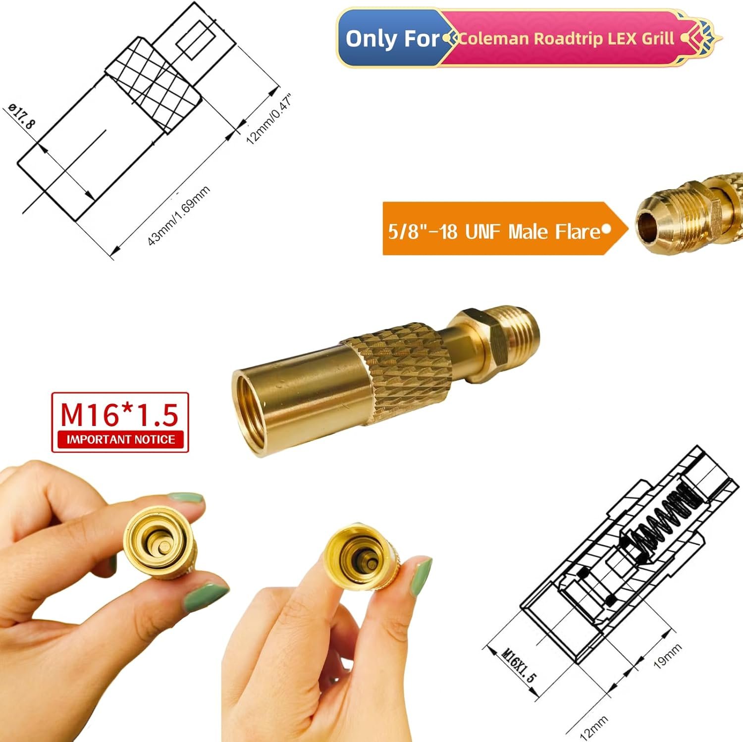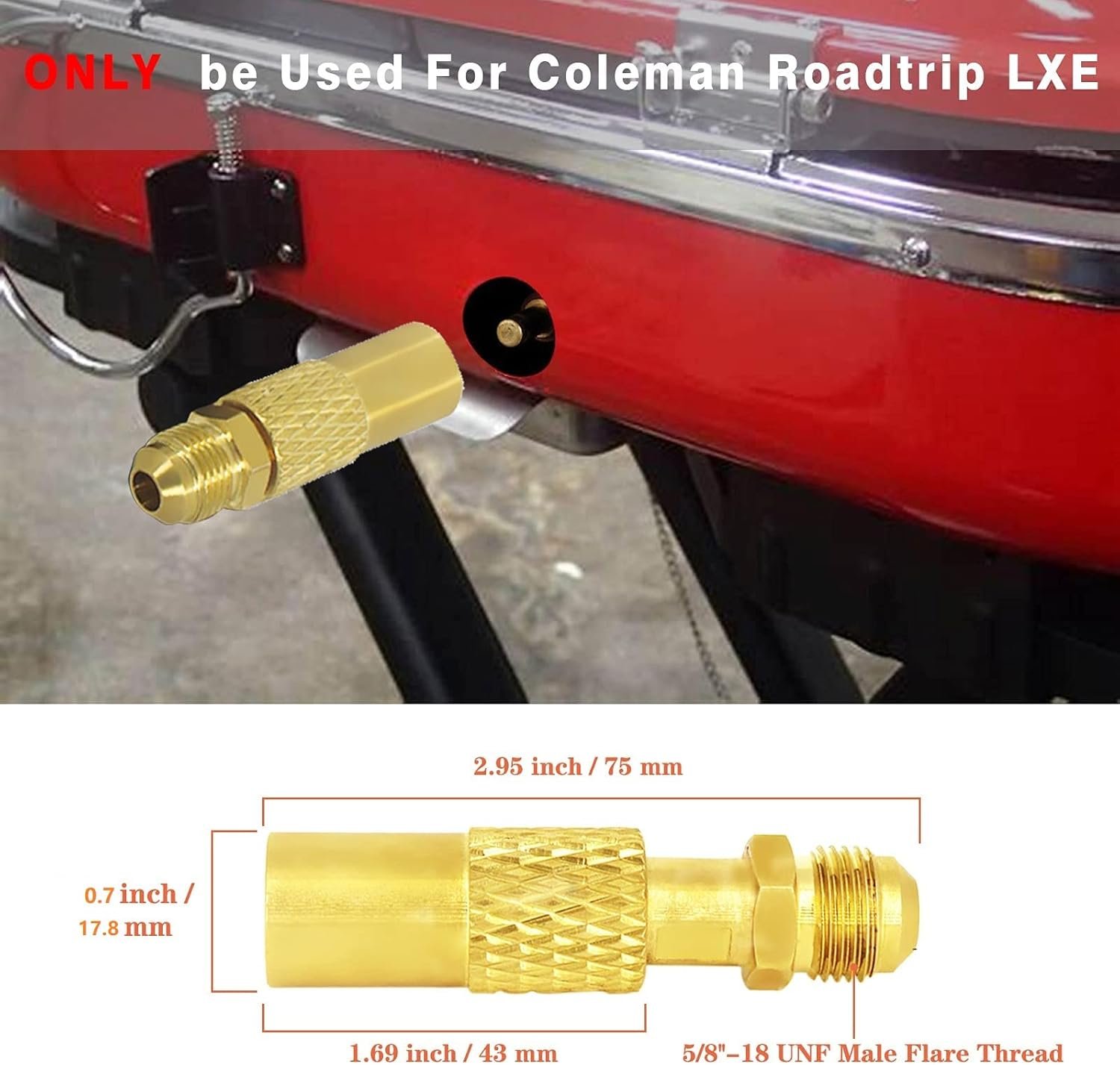 The conversion fitting only fit for Coleman Roadtrip LXE Portable GrillThe made of 100% solid brass with Knurled handle easy connect and no tools neededLow pressure application– This adapter can only connect a standard 3/8″ female flare end extension hose