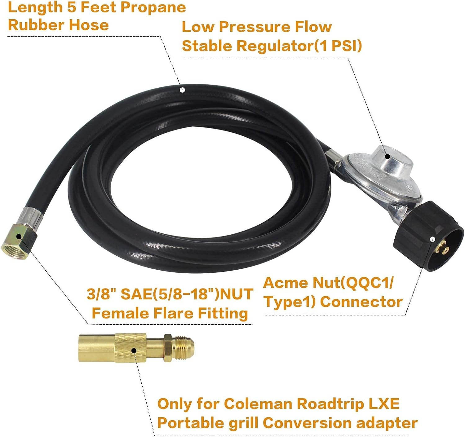 Product accessories Include 5 feet universal QCC1 low pressure propane regulator with hose and Coleman roadtrip LXE portable propane grill 3/8’’ male flare conversion adapter fitting