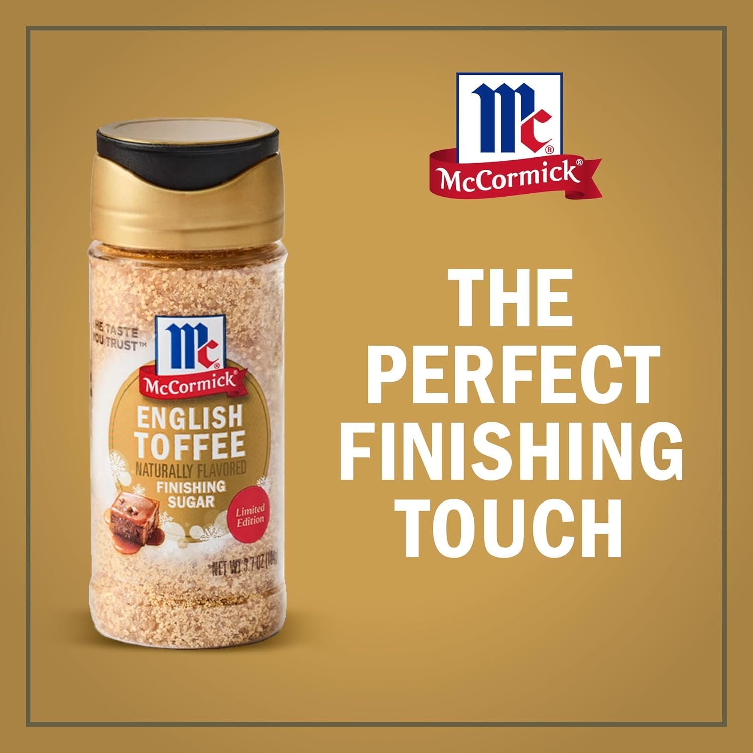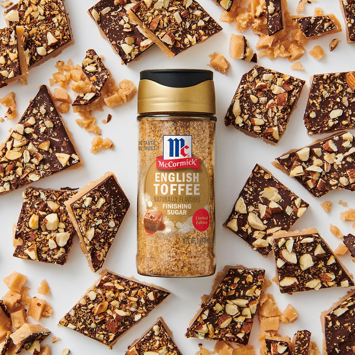 Shake on seasonal flavor with McCormick® English Toffee Naturally Flavored Finishing Sugar, Limited Edition. This rich, indulgent sugar delivers an iconic holiday flavor to everyone at your table. Available for a limited time. Crafted with ingredients including demerara sugar, brown sugar, molasses, and buttermilk, the buttery toffee flavor of this sugar complements everything from brunch to dessert. Sprinkle on frosted cupcakes, cookies, pies, ice cream, and even buttered toast or oatmeal. Make popcorn gourmet by drizzling with chocolate and sprinkling with finishing sugar. Or stir in hot cocoa, cappuccino, and lattes for the perfect finishing touch. Limited Edition Finishing Sugars are the perfect addition to your seasonal and holiday cooking and baking. Keep an eye out for new flavors throughout the year. For more inspiration on how to enjoy, visit mccormick.com/holidayflavors.