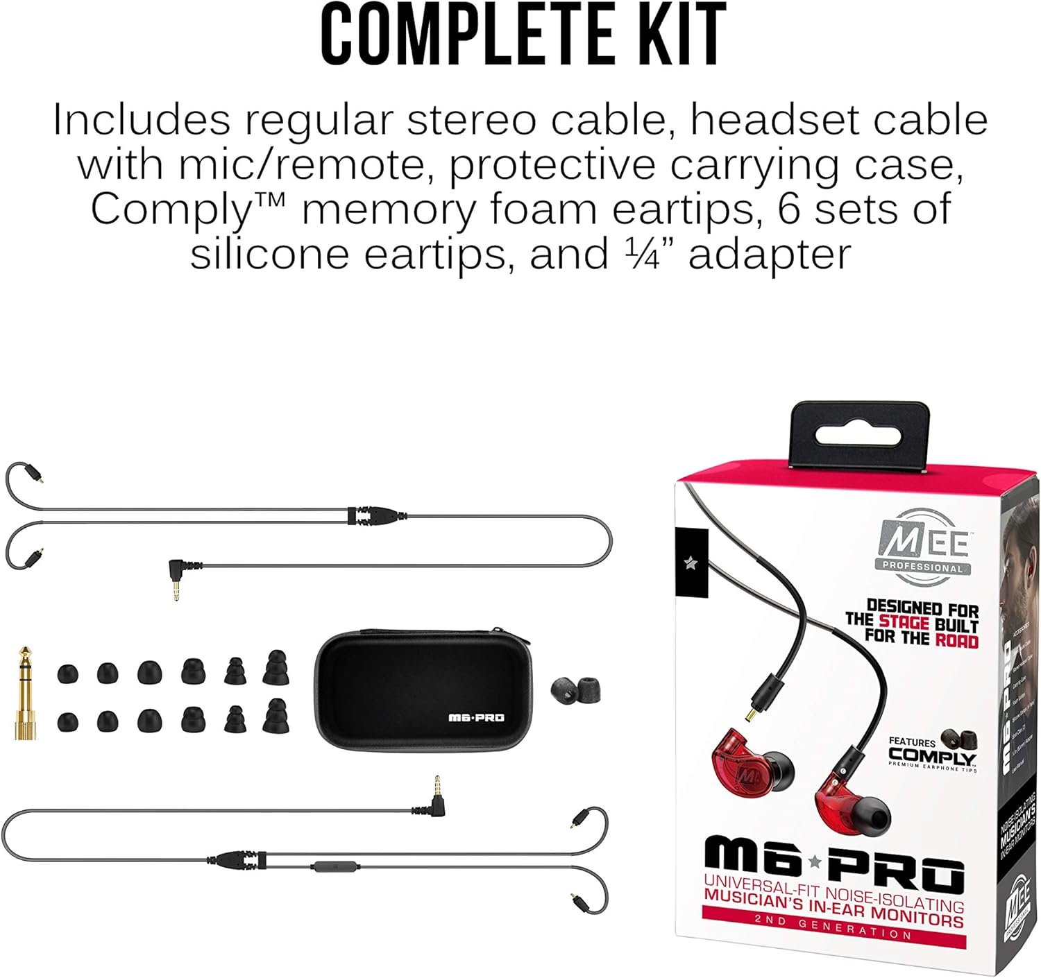 M6 PRO IEM, audio cable, headset cable, carrying case, Comply memory foam eartips, silicone eartips (6 pairs), Shirt clips (2), ¼” adapter