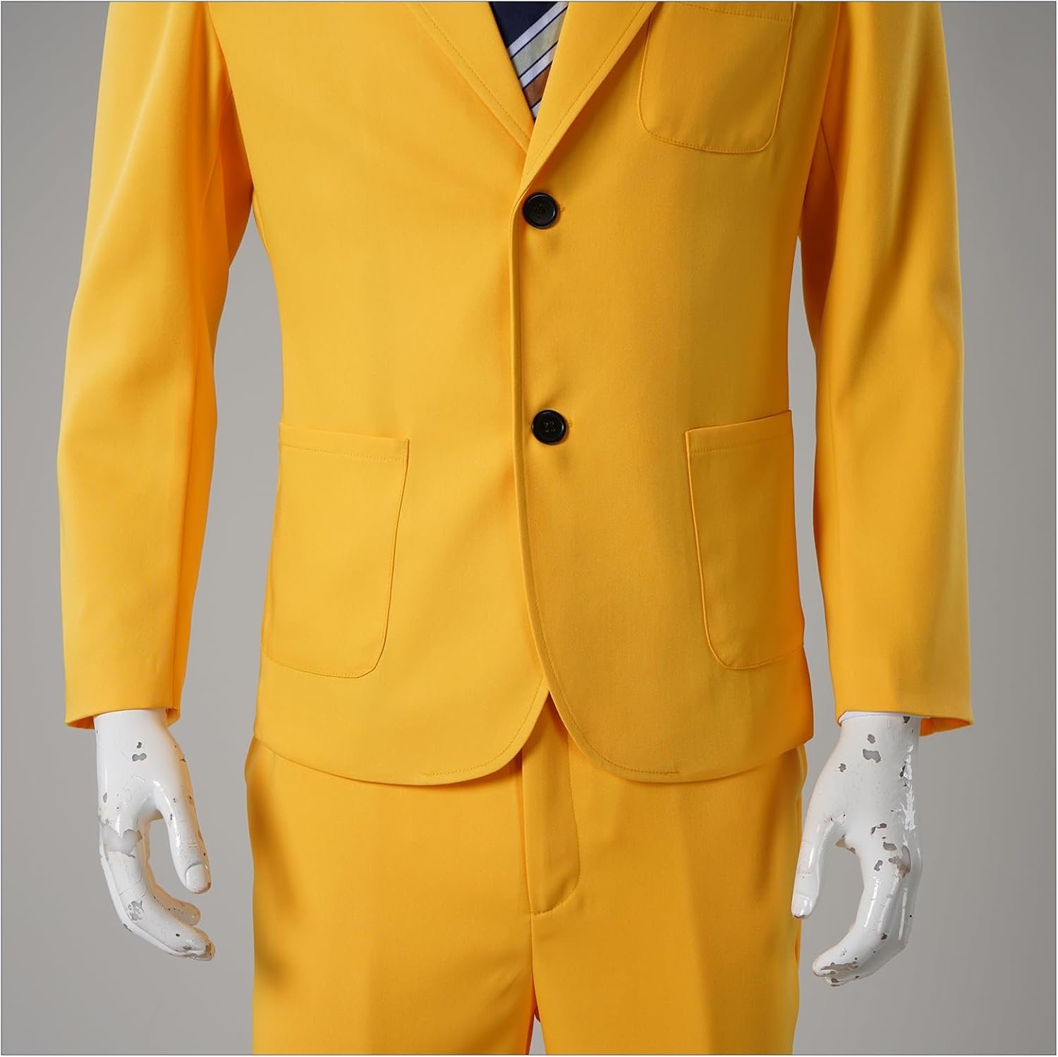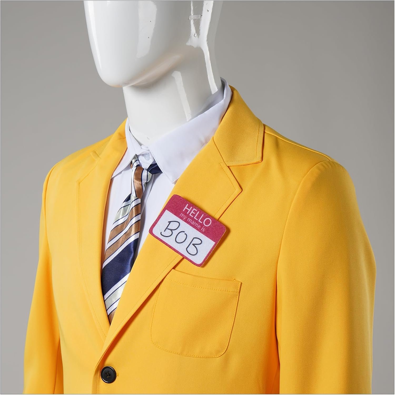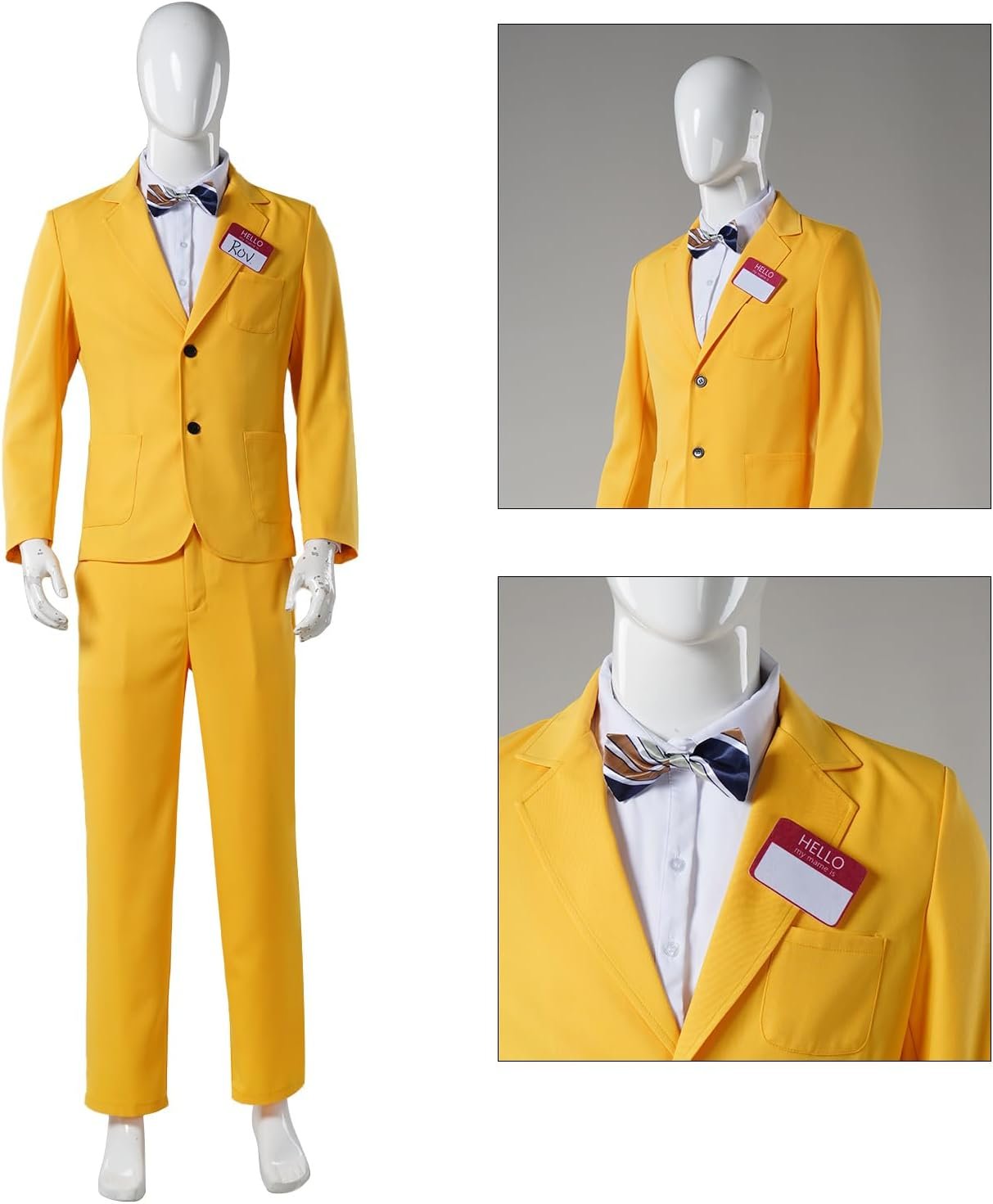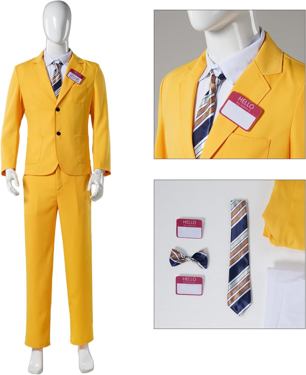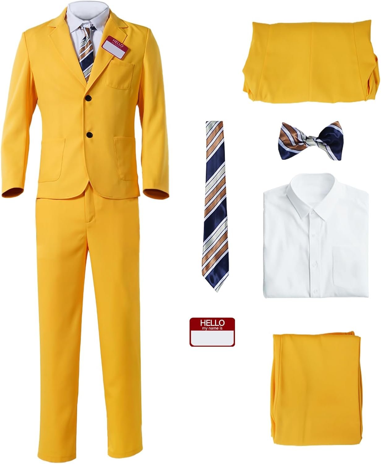 The complete costume set includes a vibrant yellow suit, matching pants, and a crisp white inner shirt. To top it off, the set comes with both a necktie and a bowtie, allowing you to customize your look with ease. The iconic “Hello” name tag is also included, adding a touch to your ensemble.