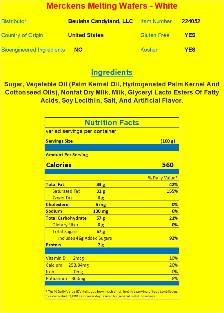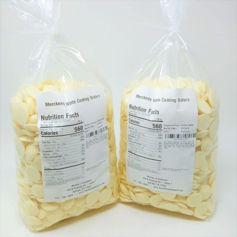 Merckens White Coating Melting Wafers. These wafers melt to a smooth and creamy texture and are similar to white chocolate. They work very nicely for all your candy-making needs.