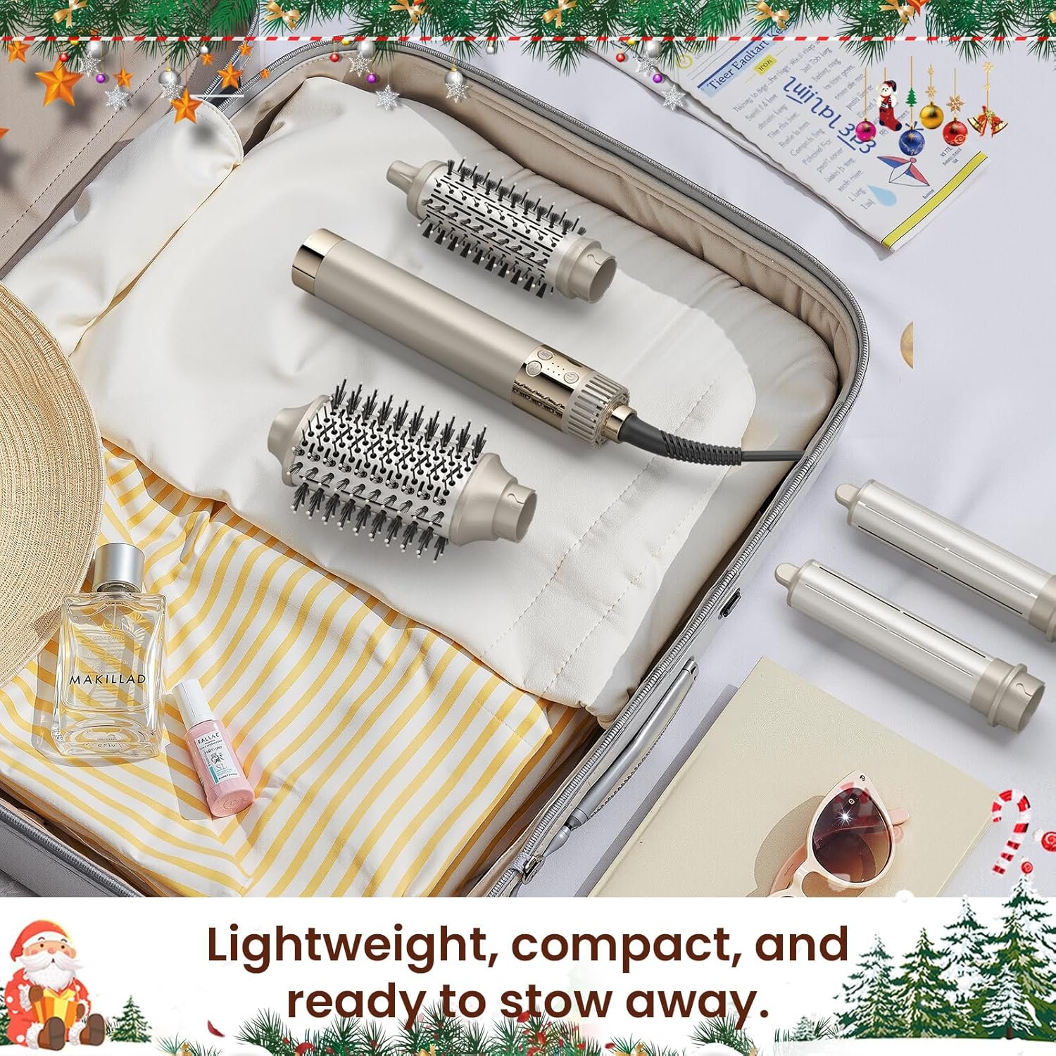 [Hands-Free Curls, Left or Right—Your Pick] – No wrist gymnastics here. This hair styler brush hair dryer set includes two separate 1.25″ curling barrels—one for each direction—so you can swap them out for perfectly balanced curls on both sides. Designed as a versatile air styler, it uses powerful airflow to gently pull and wrap your hair—no twisting, no clamps, no guesswork. A salon-ready hair styler that delivers effortless curls, minus the fuss.
