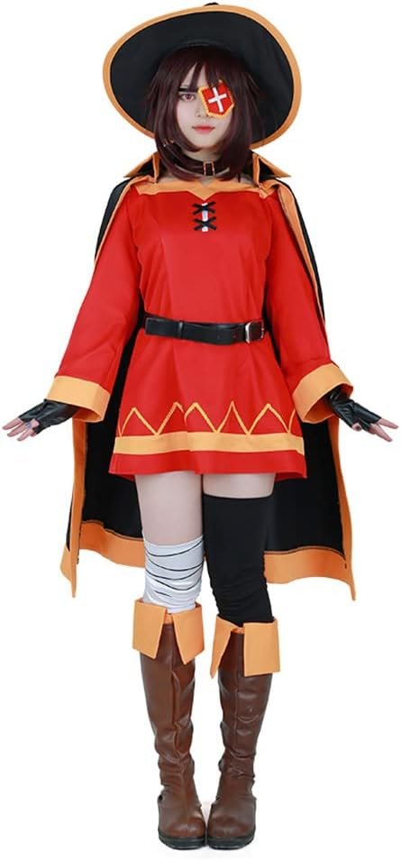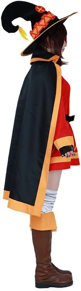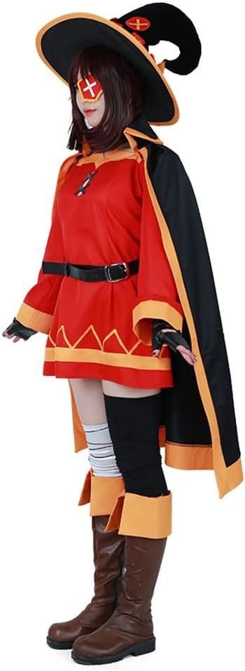 What’s in the package: ,, , Black Cloak with yellow trim Red dress with zipper Stockings Witch Hat Pu leather Belt Choker Eye patch NOT INCLUDED: