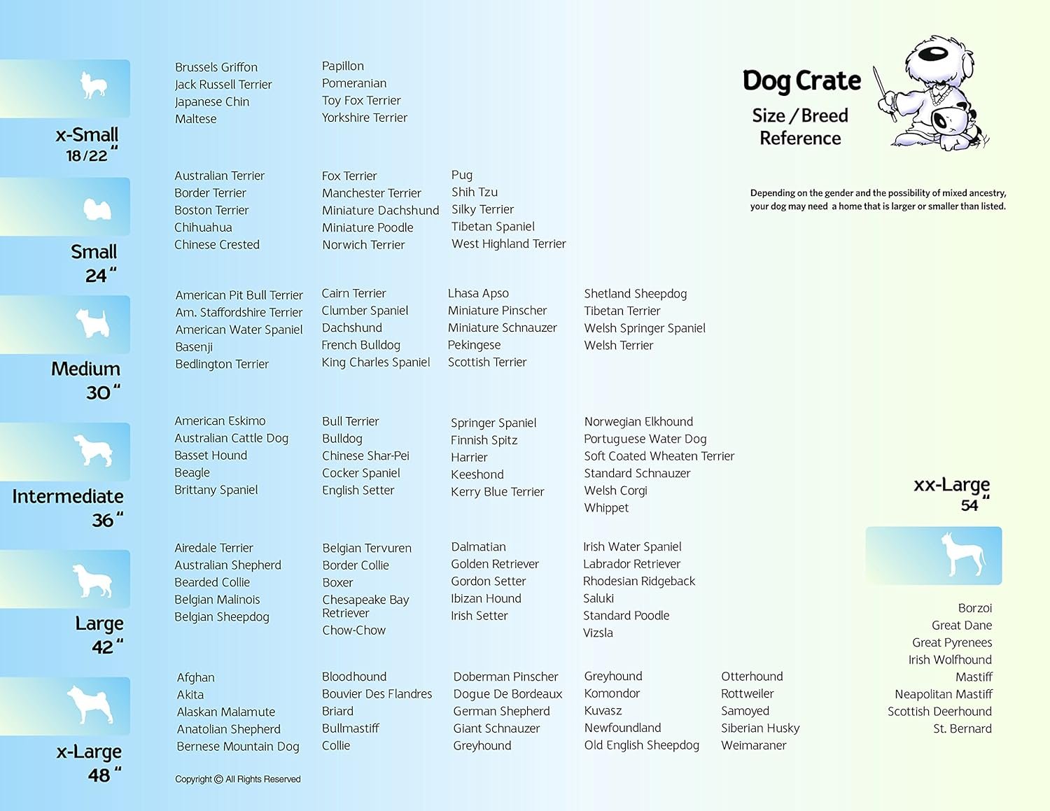 iCrate single door dog crate measures 36.6 x 21.9 x 24.5 inches and is suitable for intermediate dog breeds with an adult weight of 40 to 70 pounds. If your dog’s weight or measurements are on the higher side for this crate, we recommend buying the next crate size up