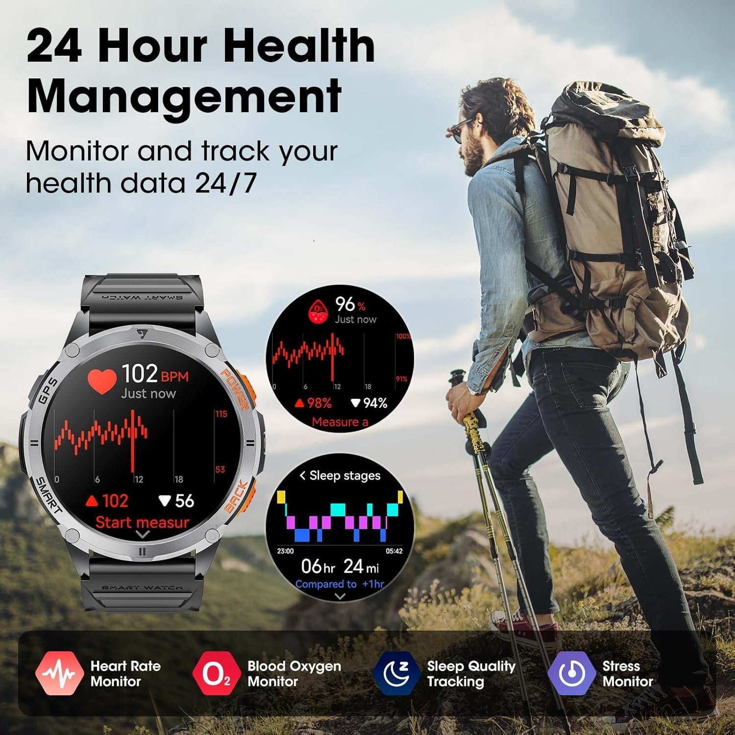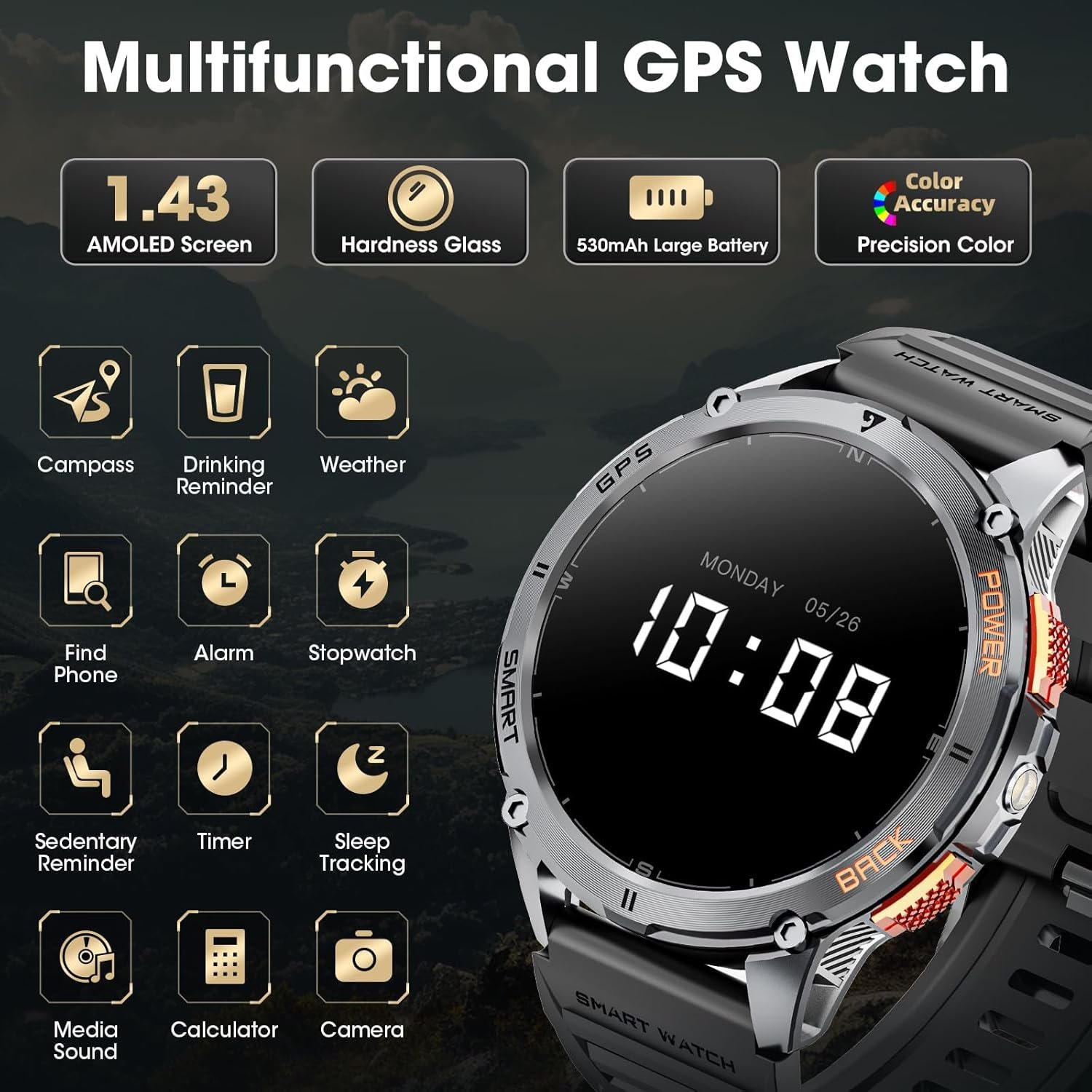 【530mAh Large Battery & LED Flashlight】The tactical smart watch has a built-in 530mAh large battery, which can be used continuously for 5-7 days after charging for 2 hours, and the standby time is up to 20 days! The men smart watches is equipped with a powerful LED flashlight, which can provide sufficient lighting for emergency situations such as camping, hiking or night adventures, making your night outings safer. At critical moments, users can also send out a distress signal by activating the light.
