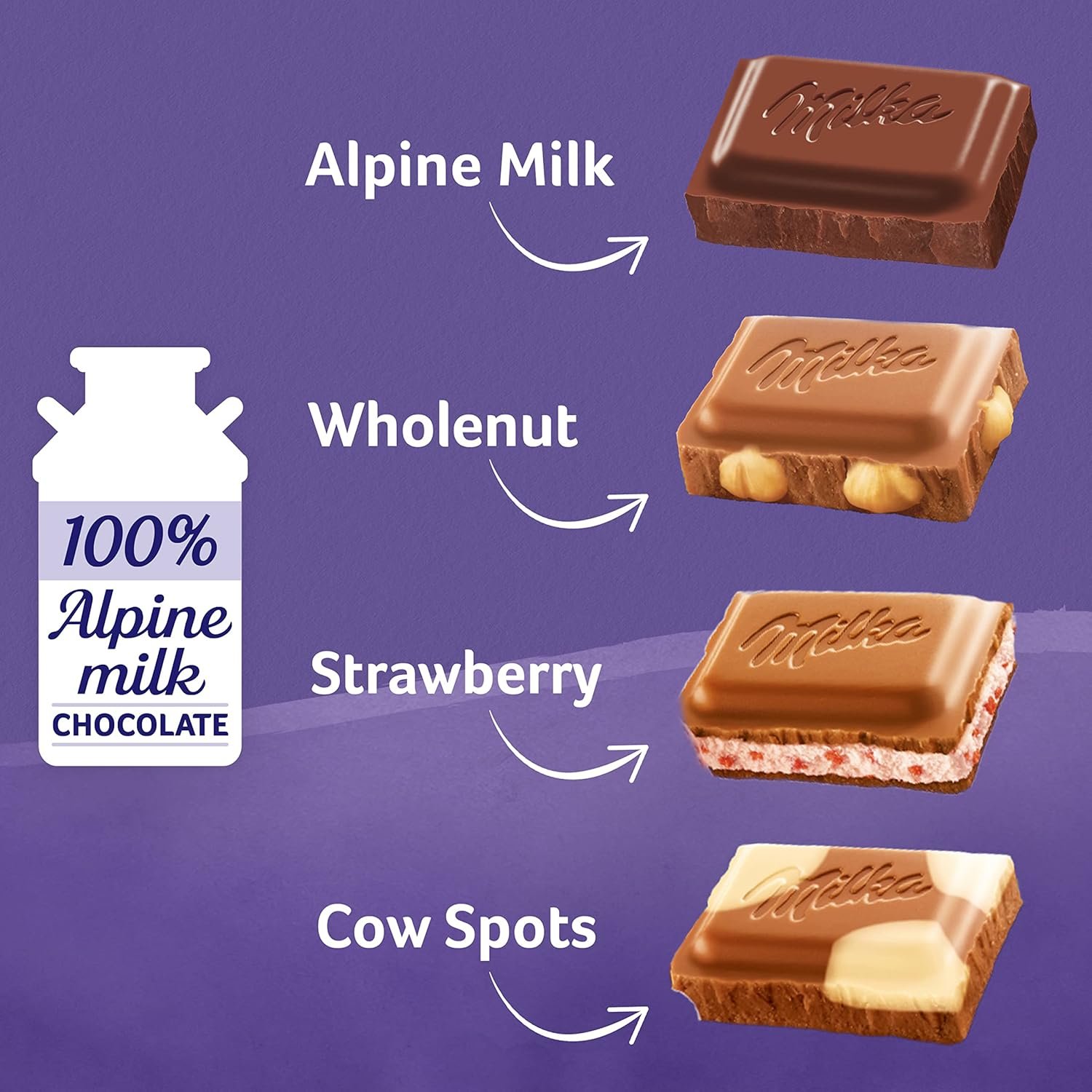 Fresh From the Alpines! For more than 20 years, only 100% Alpine milk has been used to create Milka’s Milk Chocolate. Sourced from family-run farms in the Alpine region and foothills, this milk is what gives the chocolate its iconic taste and delicate texture. Milka’s high-quality cocoa is sustainably sourced in partnership with the Cocoa Life program, making for a delicious and feel-good chocolate experience. Discover Milka – Allow yourself to be carried away by delicate Alpine Milk Chocolate. These gourmet European chocolate bars are perfect for any occasion. Unwind after dinner, relax with a midafternoon treat, or share some Alpine goodness with friends and family. This bulk chocolate variety pack contains 10 – 3.52 oz Milka chocolate bars (Milka Alpine Milk Chocolate, Milka Strawberry Chocolate, Milka Cow Spots Chocolate & Milka Wholenut Hazelnut Chocolate).