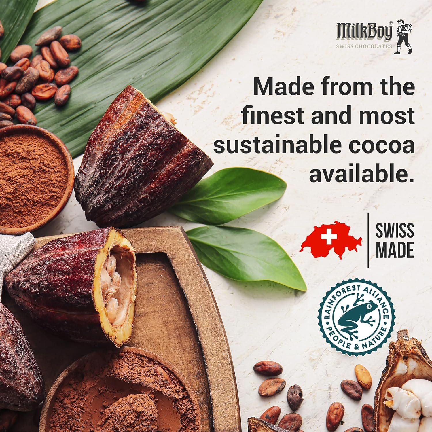 Support Sustainable Farming – MilkBoy is dedicated to remaining true to our historical heritage and origins in the pristine Swiss alpine mountain region. We take the sustainability issues of our global natural resources seriously and therefore use only Rainforest Alliance-certified sustainably farmed cocoa beans in our artisan chocolate.
