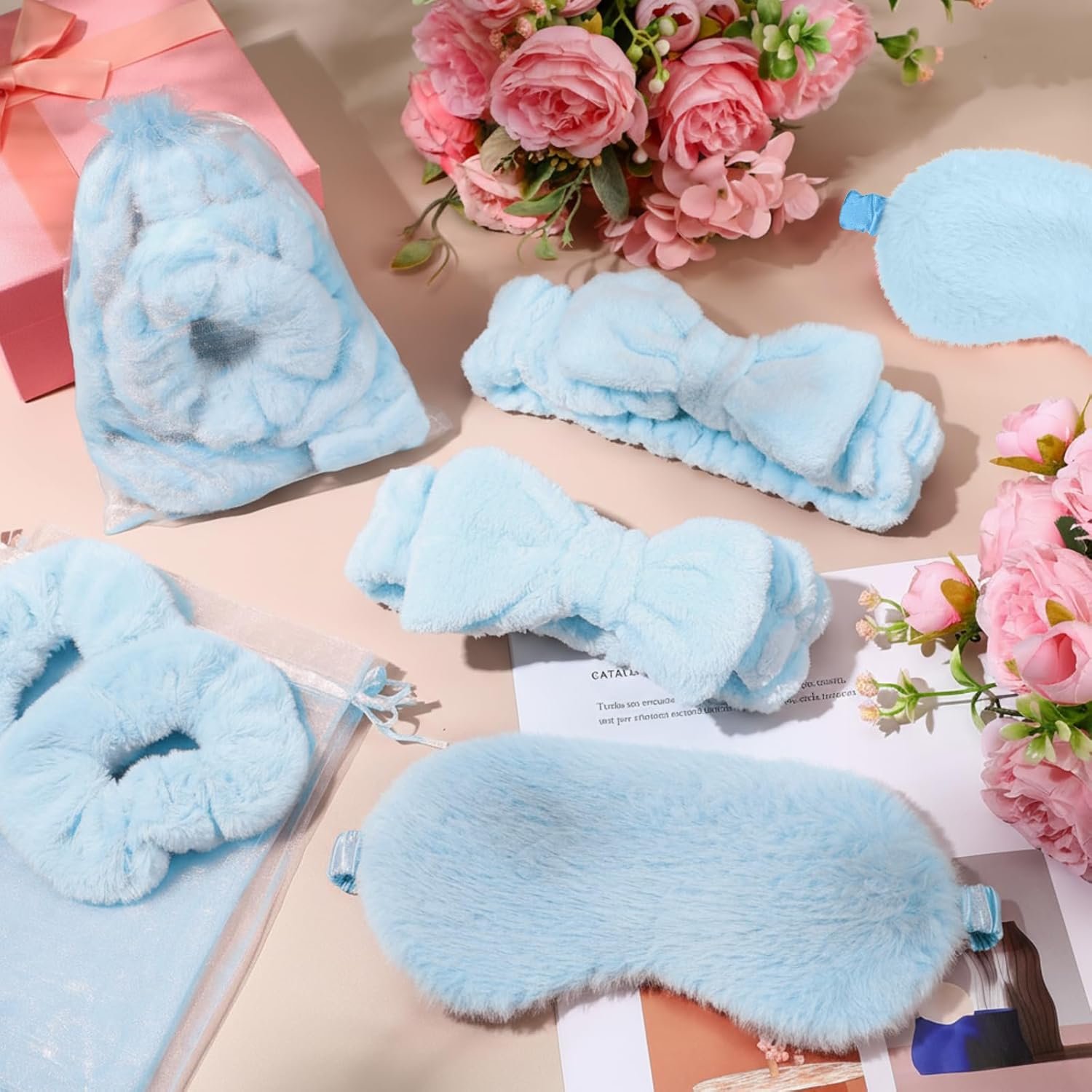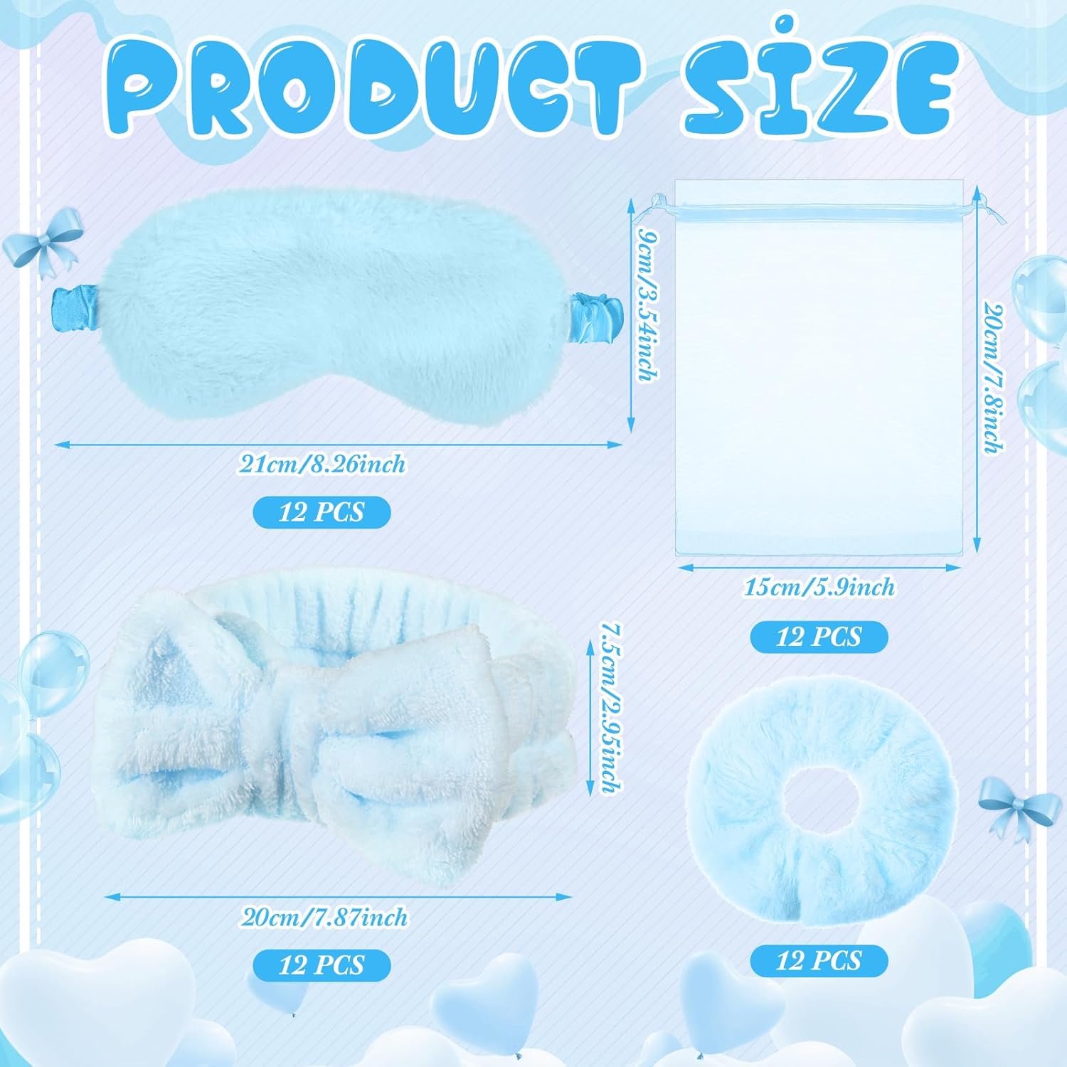Impressive Spa Party Favor Set: this sleepover party favors include 48 pieces of blue spa party accessories; 12 spa headbands, 12 plush eye masks, 12 coral velvet scrunchies, and 12 organza bags; With this substantial assortment, not only do you have enough accessories to share with your partner but also all the necessities for your spa day