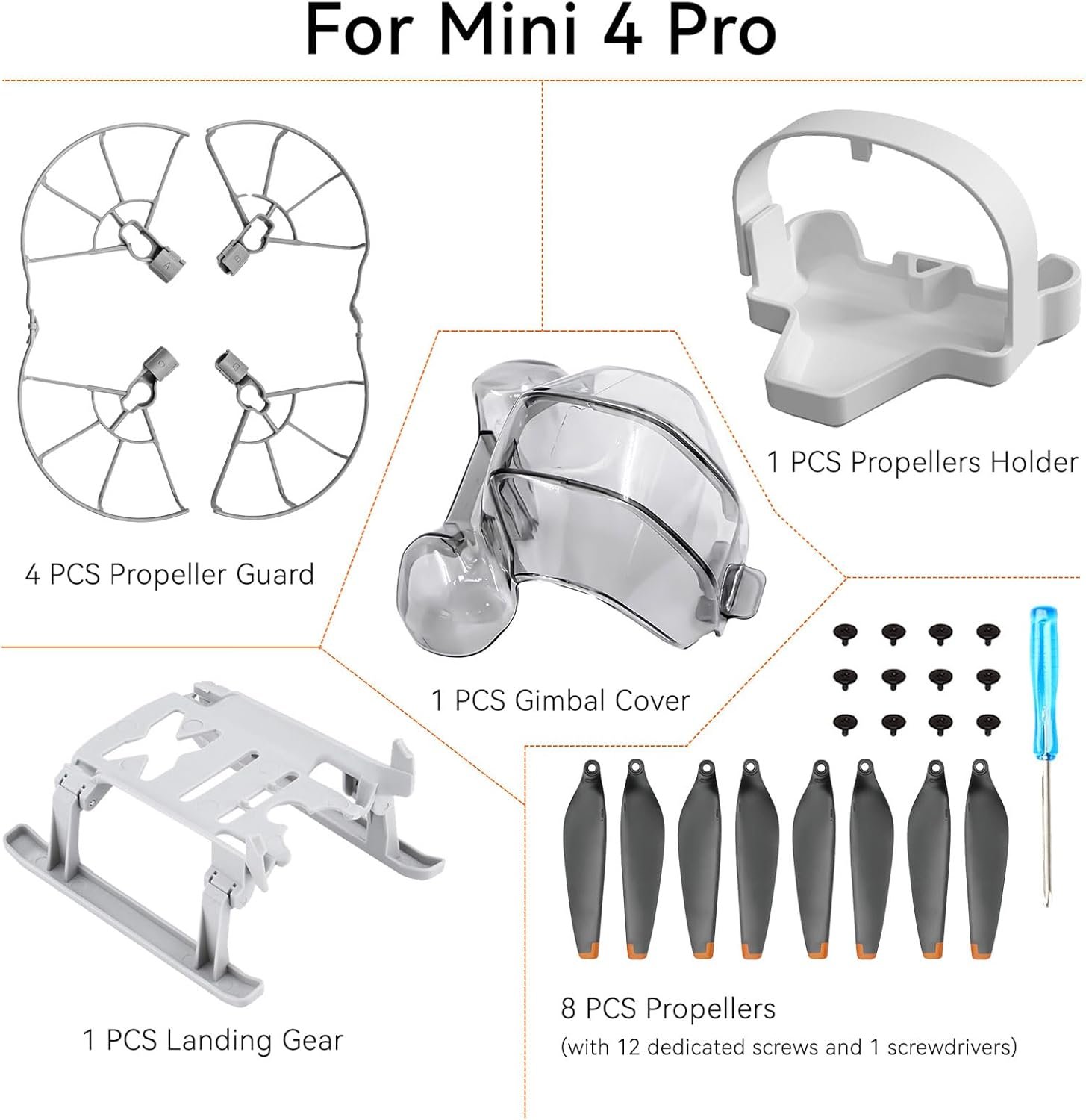 【Mini 4 Pro Accessories】Accessory kit includes 8 x low-noise blades (with 1 screwdriver) , 1 x propeller strap, 1 set propeller guards, 1 x landing gear, 1 x lens cover, only suitable for DJI Mini 4 Pro drone (Note: not suitable for DJI Mini 5 Pro/Mini 4K drone)